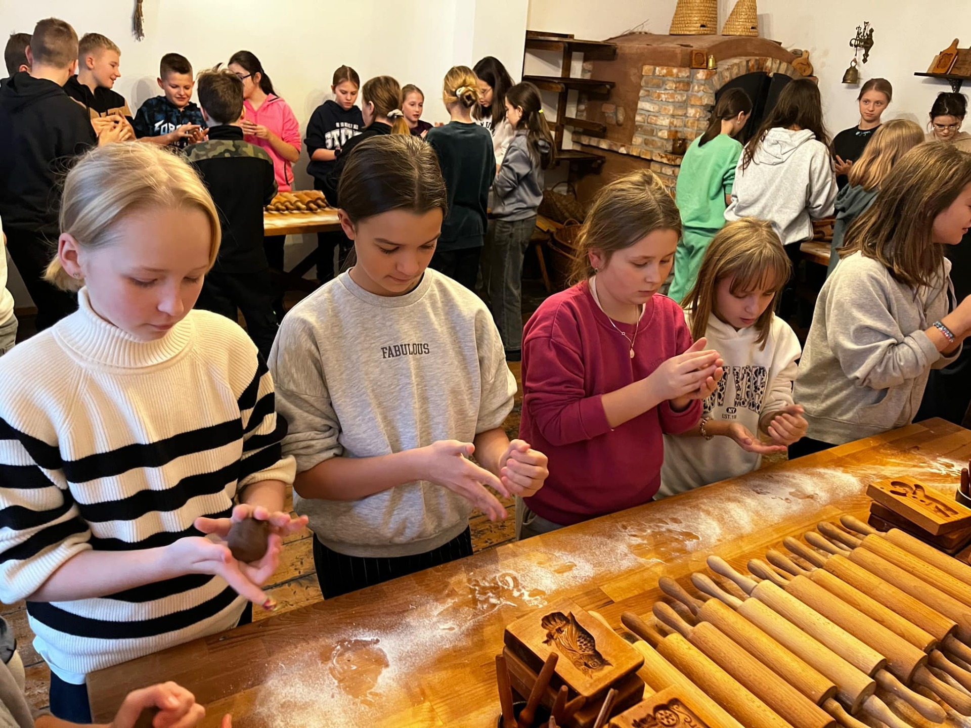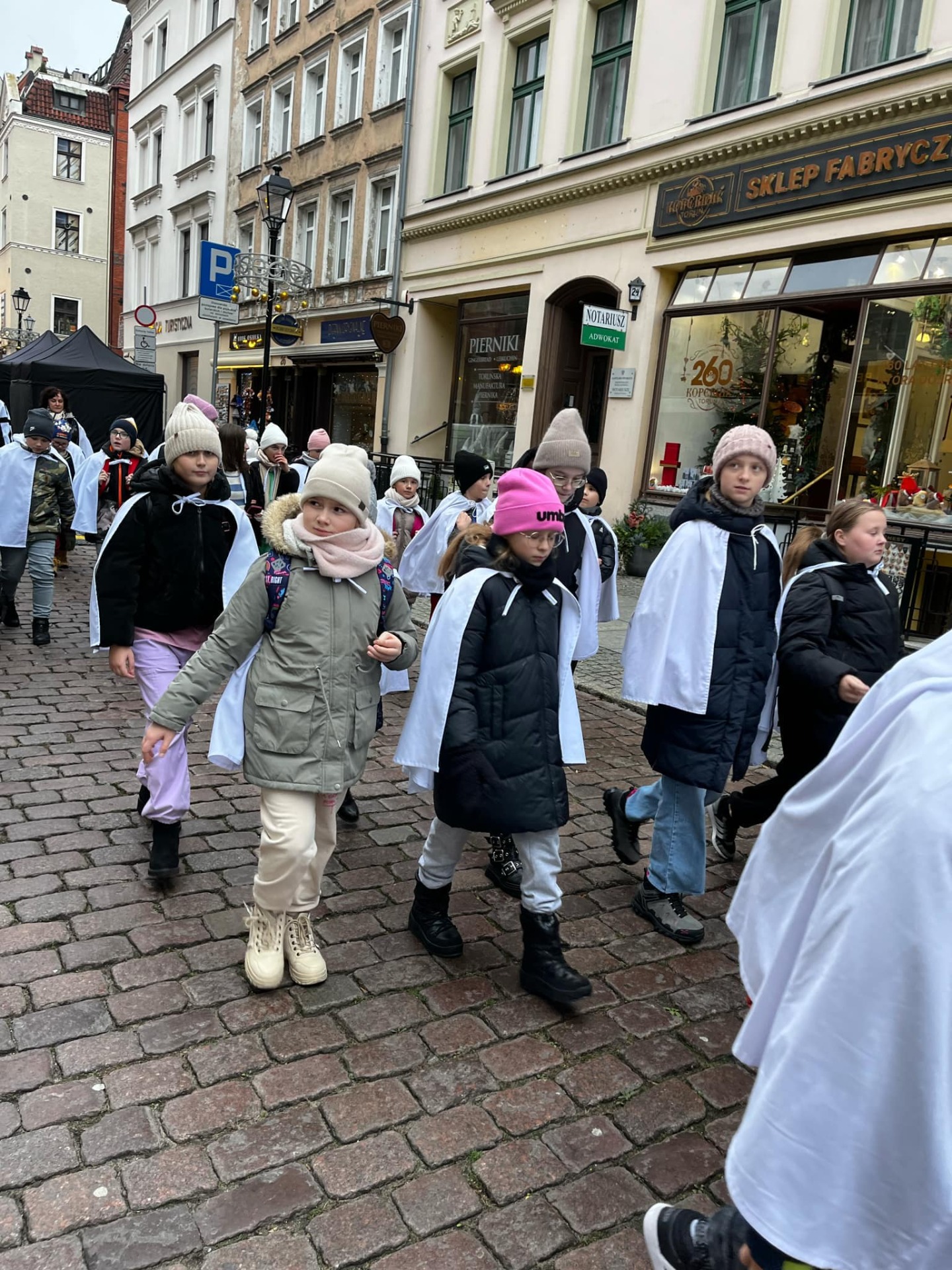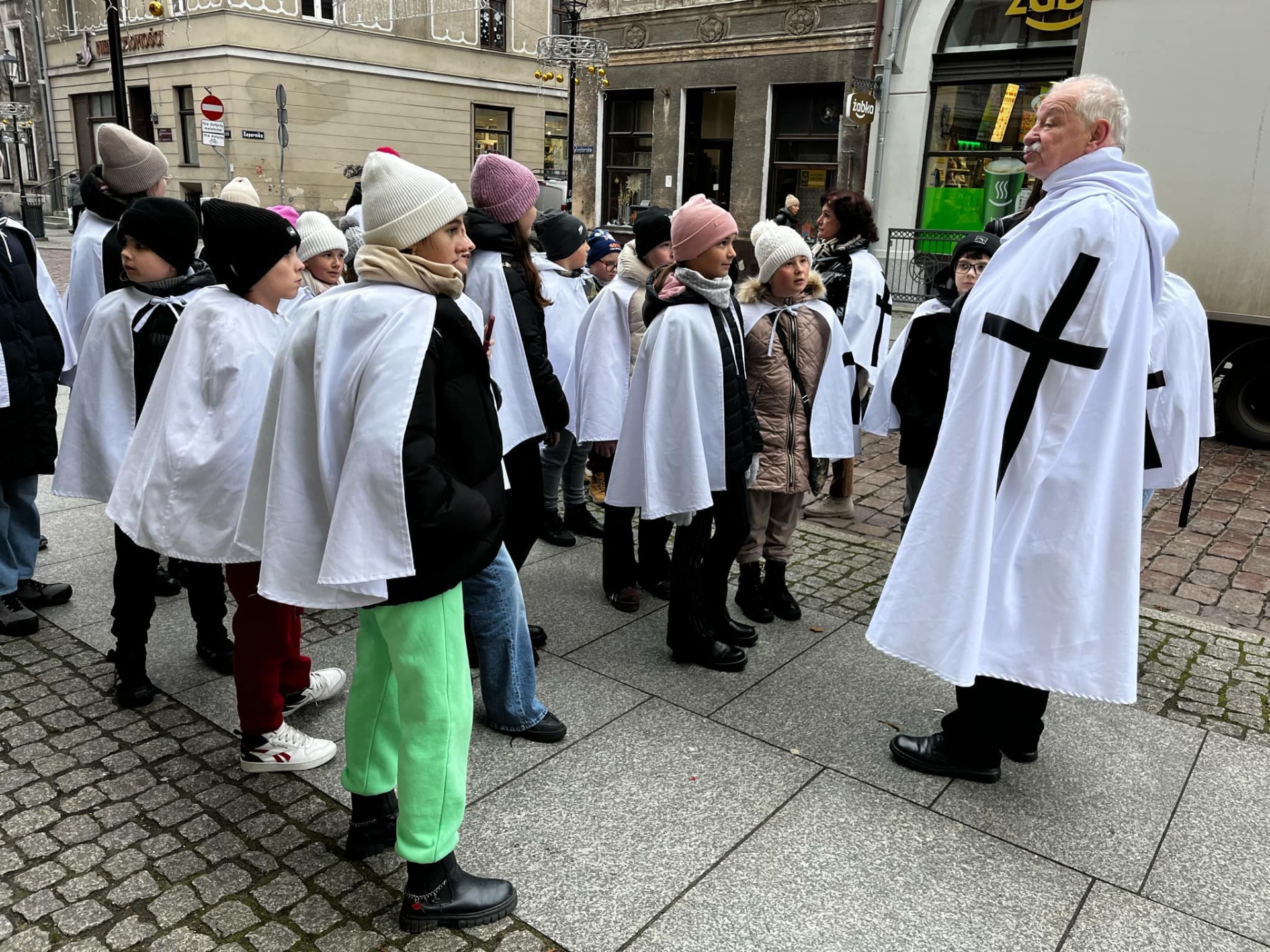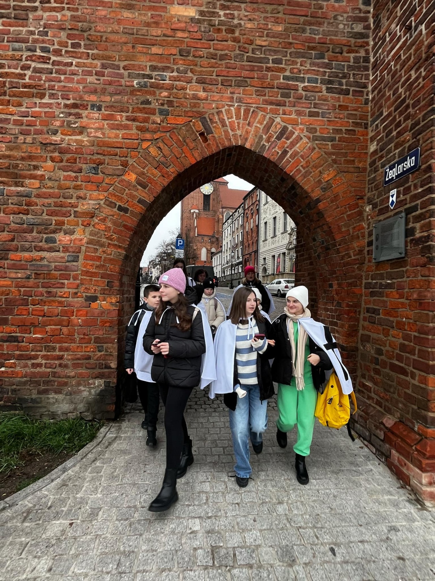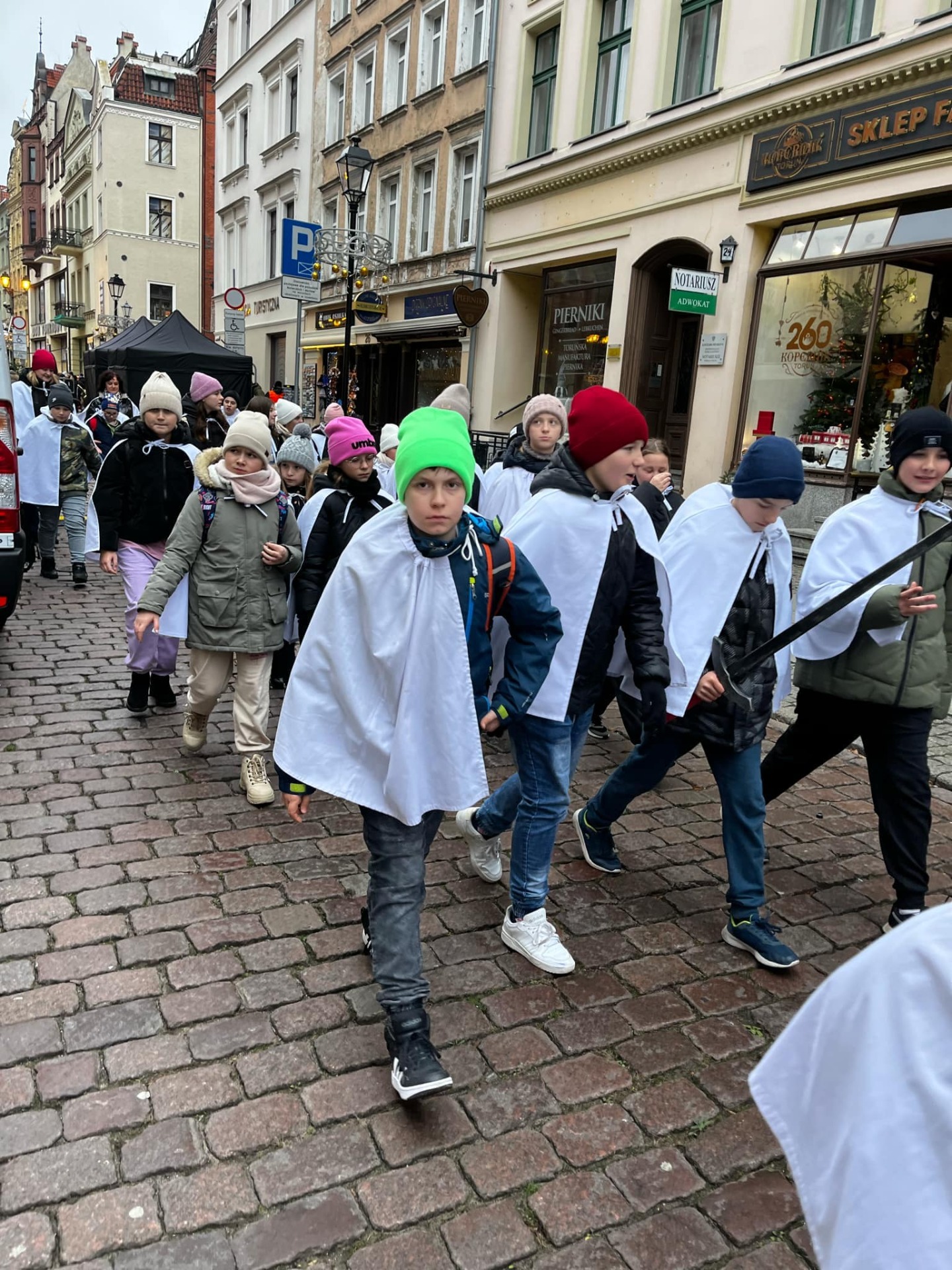 11 grudnia uczniowie klas IV-VI odwiedzili piękne miasto Toruń. Po spotkaniu z przewodnikami w dwóch grupach udali się na zwiedzanie przebrani w krzyżackie stroje. Podczas spaceru uliczkami miasta poznali Toruń z epoki średniowiecza. Usłyszeli anegdoty i przypowieści z codziennego życia torunian, zobaczyli Katedrę św. Janów, Dom Mikołaja Kopernika, Krzywą Wieżę, Rynek Staromiejski z gotyckim Ratuszem i pomnikiem Kopernika.Mieli okazję zobaczyć również pracę aktorów: p. Olgi Bołądź, p. Barbary Kurdej-Szatan podczas nagrywania scen do filmu „Piernikowe serce” w reżyserii Piotra Wereśniaka. Minęli również znanego dziennikarza, kucharza i podróżnika p. Roberta Makłowicza. Po zakończeniu zwiedzania odpoczęli w wygodnych fotelach w sali Planetarium i obejrzeli seans „Zostać astronomem”. Po seansie mogli kupić pamiątki, pierniki i pooglądać stoiska Jarmarku Bozonarodzeniowego. Głównym punktem wyjazdu były odwiedziny w Piekarni Starotoruńskiej. Podczas pokazu i zajęć poznali historię wypiekania pierników, a także mogli samodzielnie przygotować te słodkie ciastka i po upieczeniu zabrać do domu.W drodze powrotnej nie mogło oczywiście zabraknąć pobytu w restauracji McDonald’s. Podczas jazdy autokarem uczniowie śpiewali kolędy i ulubione piosenki. Zadowoleni i zmęczeni podróżą o godzinie 19.00 spotkali się pod szkołą z rodzicami.