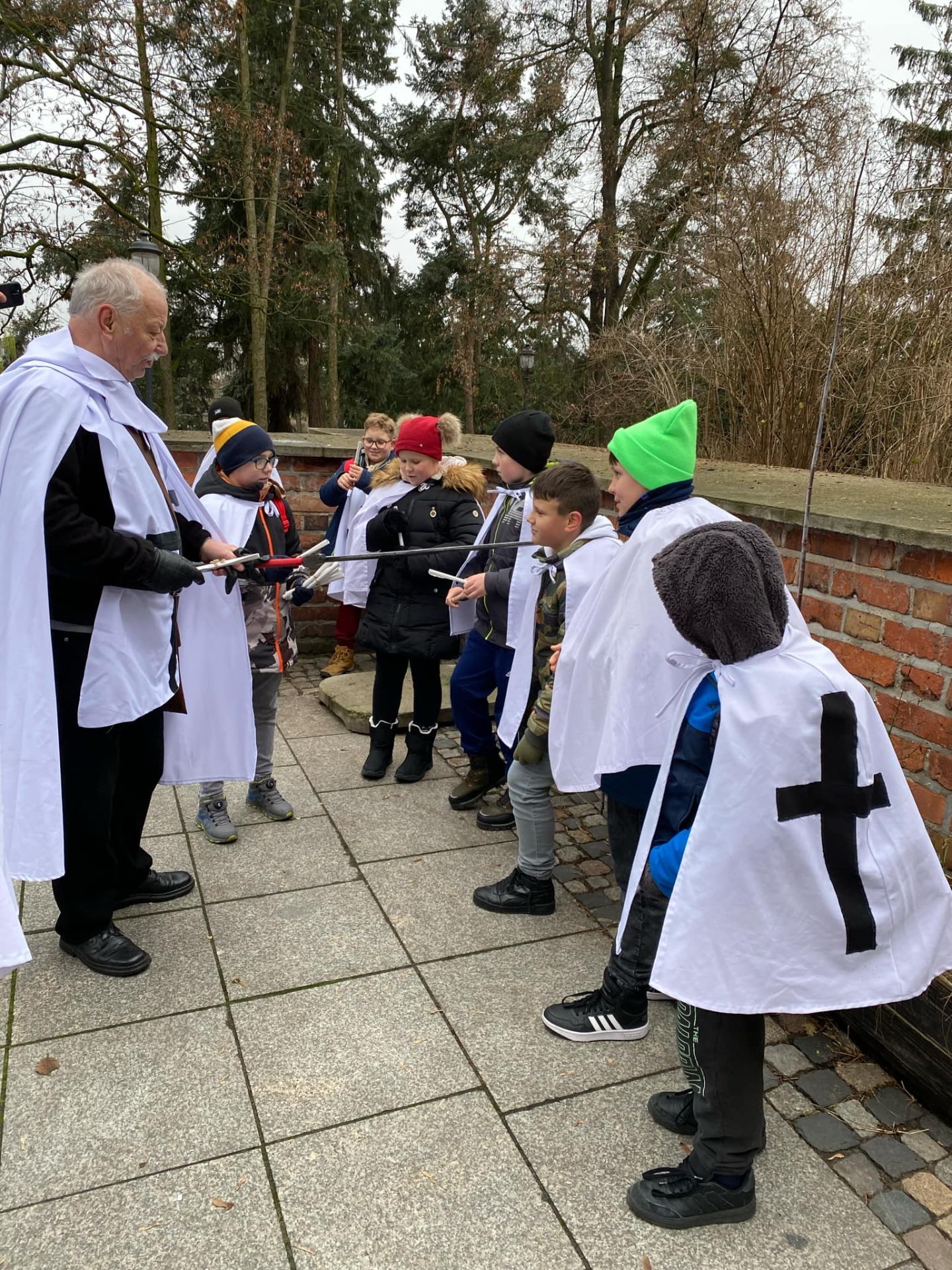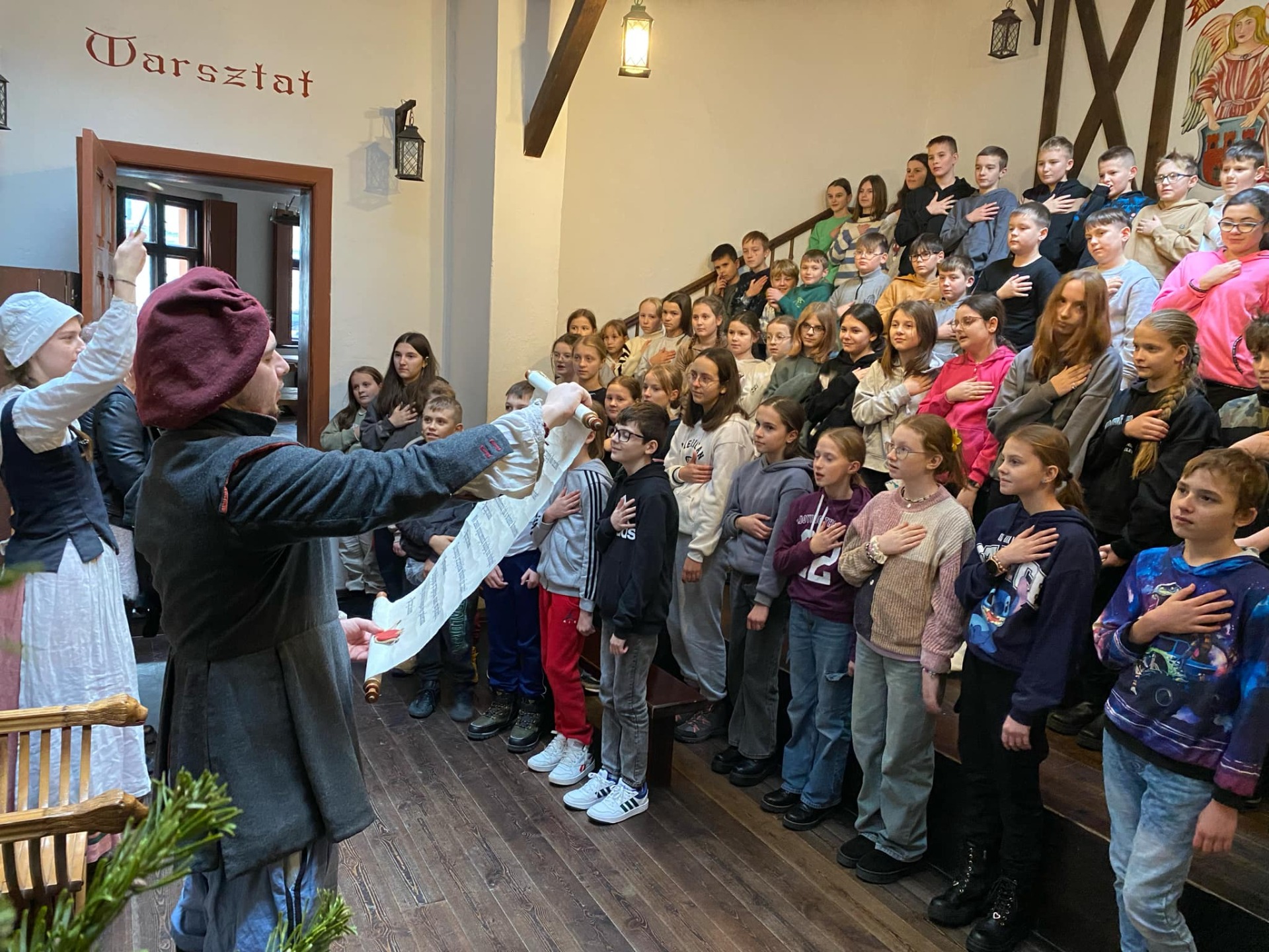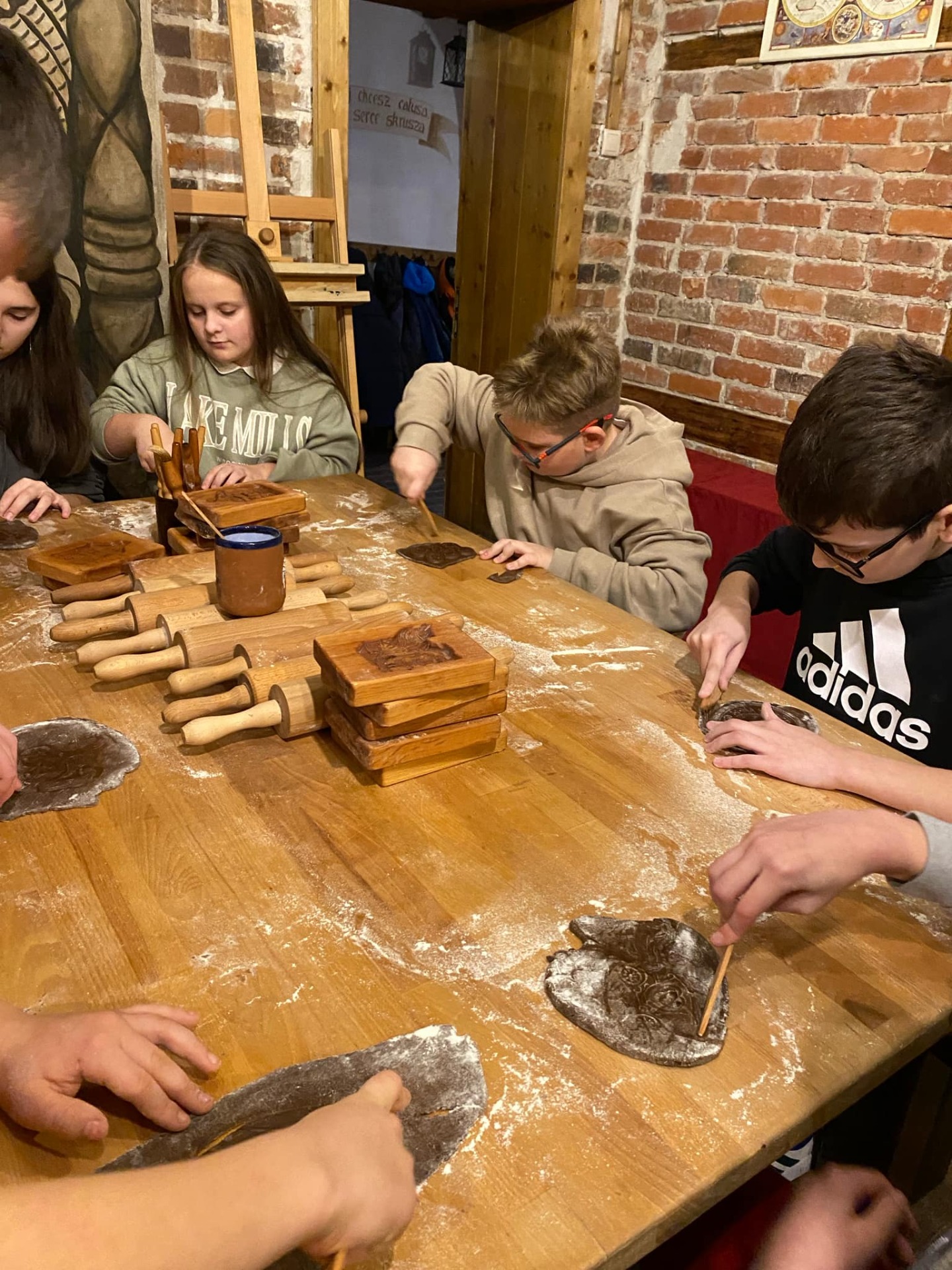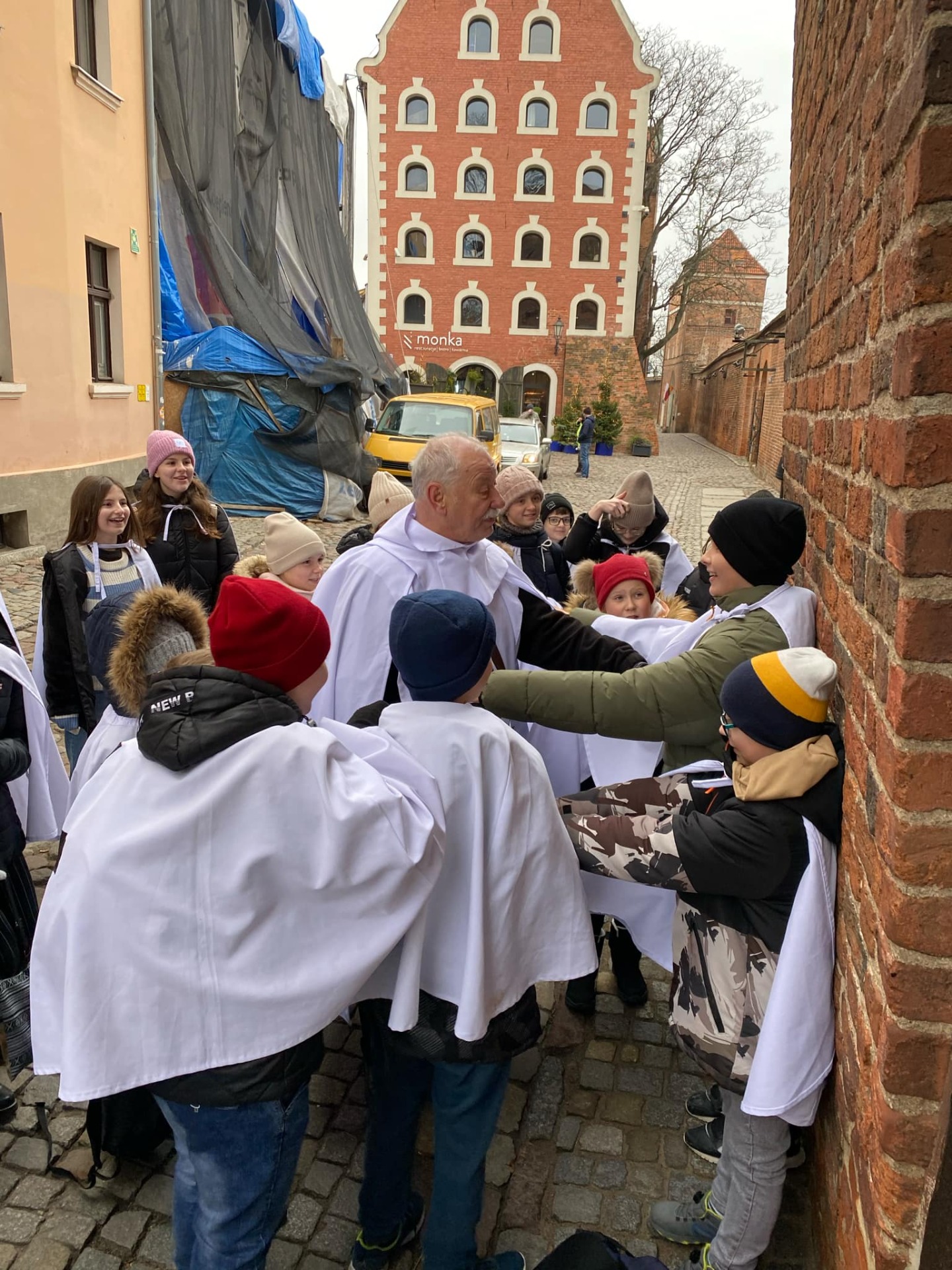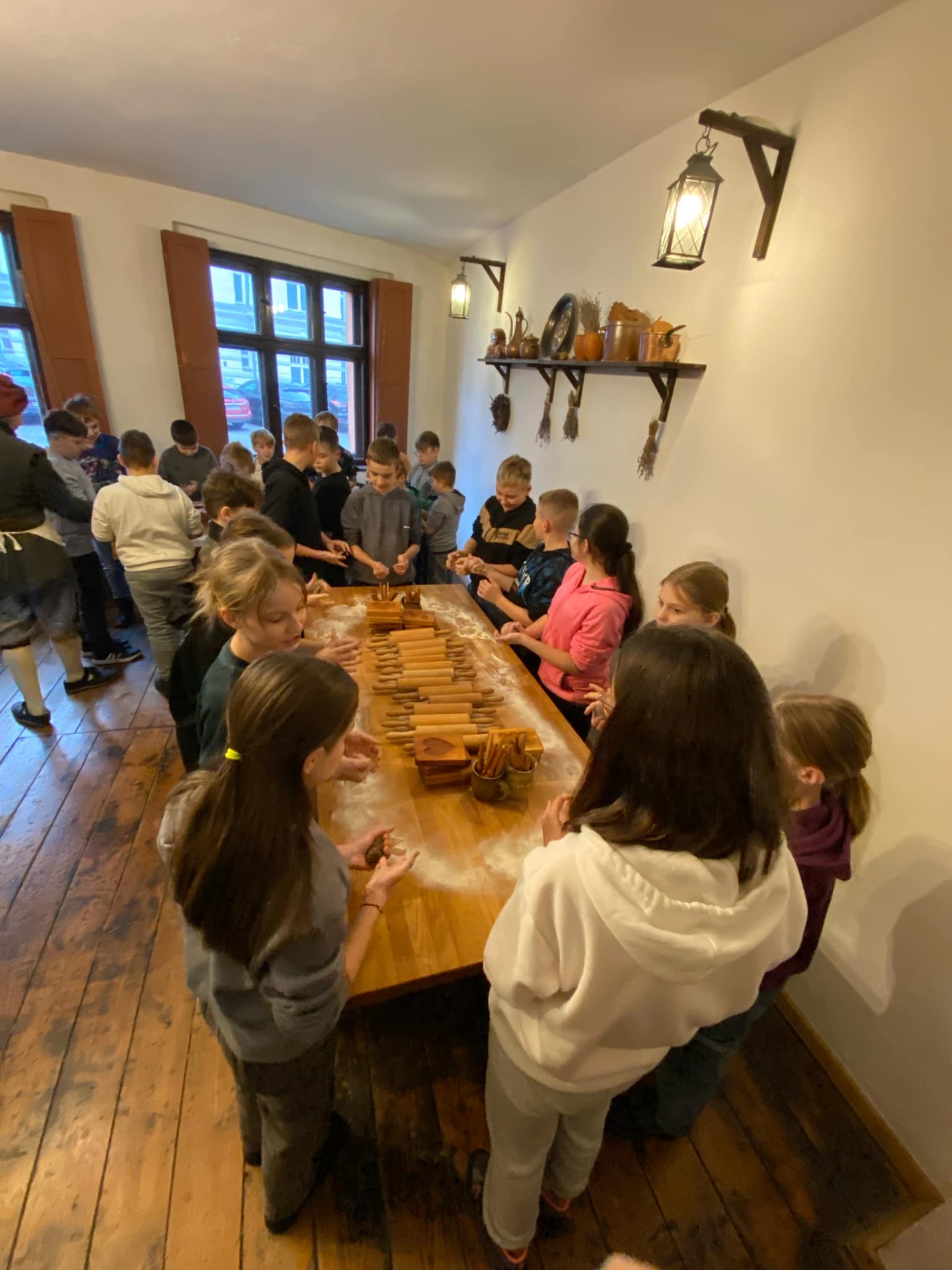 11 grudnia uczniowie klas IV-VI odwiedzili piękne miasto Toruń. Po spotkaniu z przewodnikami w dwóch grupach udali się na zwiedzanie przebrani w krzyżackie stroje. Podczas spaceru uliczkami miasta poznali Toruń z epoki średniowiecza. Usłyszeli anegdoty i przypowieści z codziennego życia torunian, zobaczyli Katedrę św. Janów, Dom Mikołaja Kopernika, Krzywą Wieżę, Rynek Staromiejski z gotyckim Ratuszem i pomnikiem Kopernika.Mieli okazję zobaczyć również pracę aktorów: p. Olgi Bołądź, p. Barbary Kurdej-Szatan podczas nagrywania scen do filmu „Piernikowe serce” w reżyserii Piotra Wereśniaka. Minęli również znanego dziennikarza, kucharza i podróżnika p. Roberta Makłowicza. Po zakończeniu zwiedzania odpoczęli w wygodnych fotelach w sali Planetarium i obejrzeli seans „Zostać astronomem”. Po seansie mogli kupić pamiątki, pierniki i pooglądać stoiska Jarmarku Bozonarodzeniowego. Głównym punktem wyjazdu były odwiedziny w Piekarni Starotoruńskiej. Podczas pokazu i zajęć poznali historię wypiekania pierników, a także mogli samodzielnie przygotować te słodkie ciastka i po upieczeniu zabrać do domu.W drodze powrotnej nie mogło oczywiście zabraknąć pobytu w restauracji McDonald’s. Podczas jazdy autokarem uczniowie śpiewali kolędy i ulubione piosenki. Zadowoleni i zmęczeni podróżą o godzinie 19.00 spotkali się pod szkołą z rodzicami.