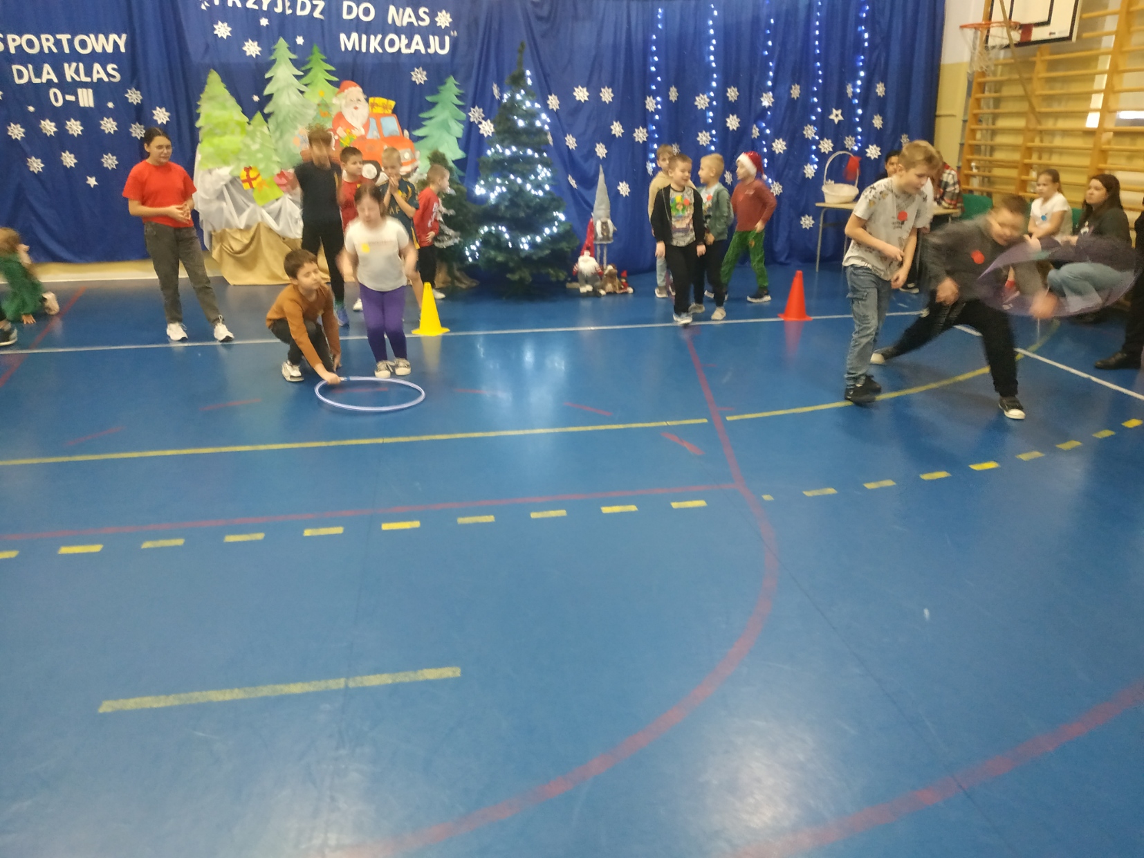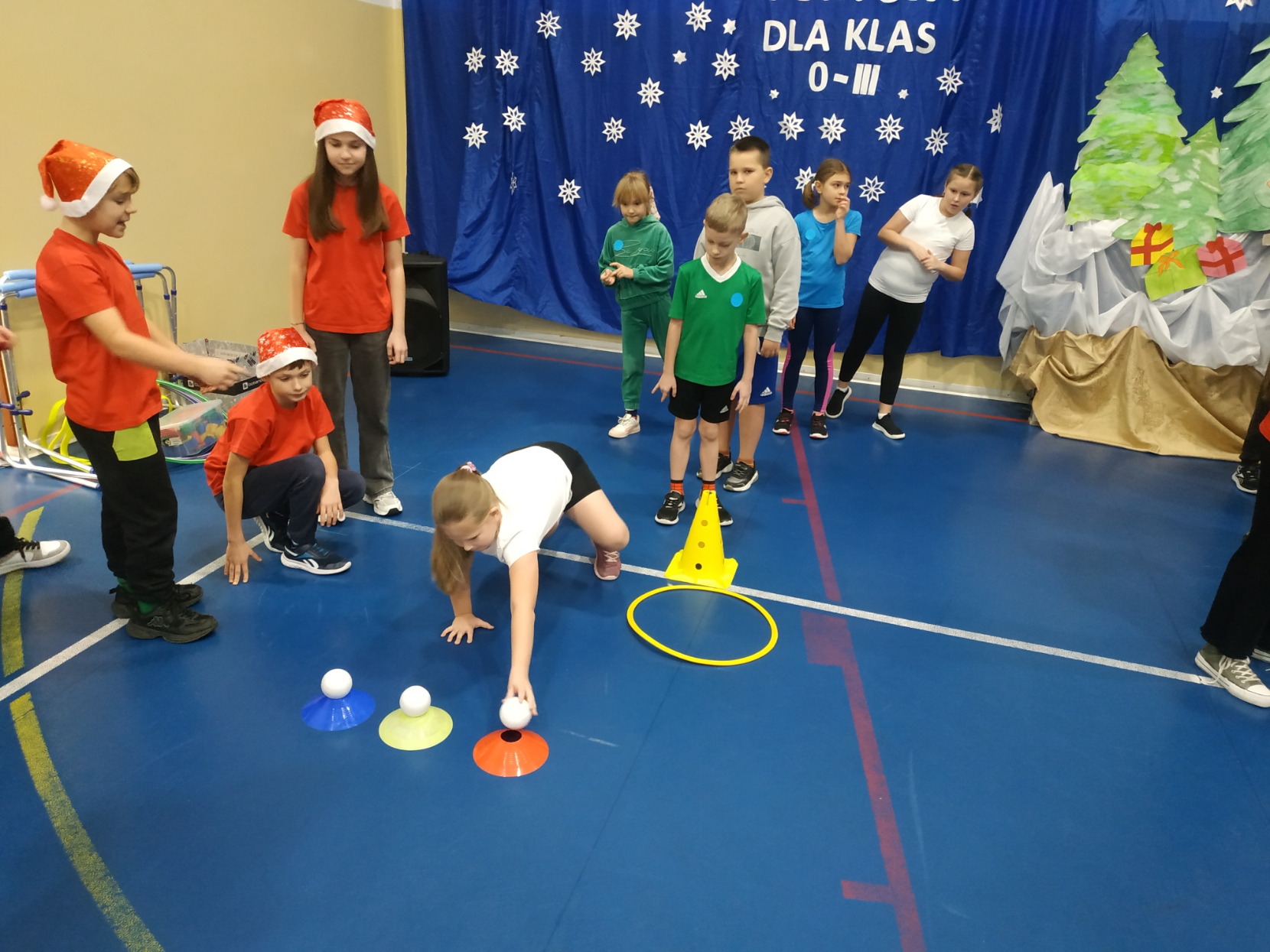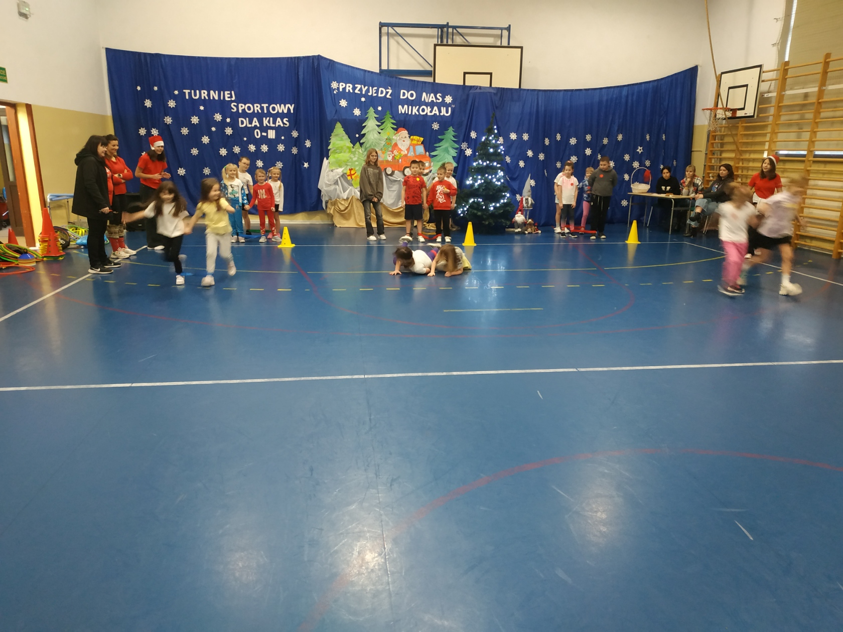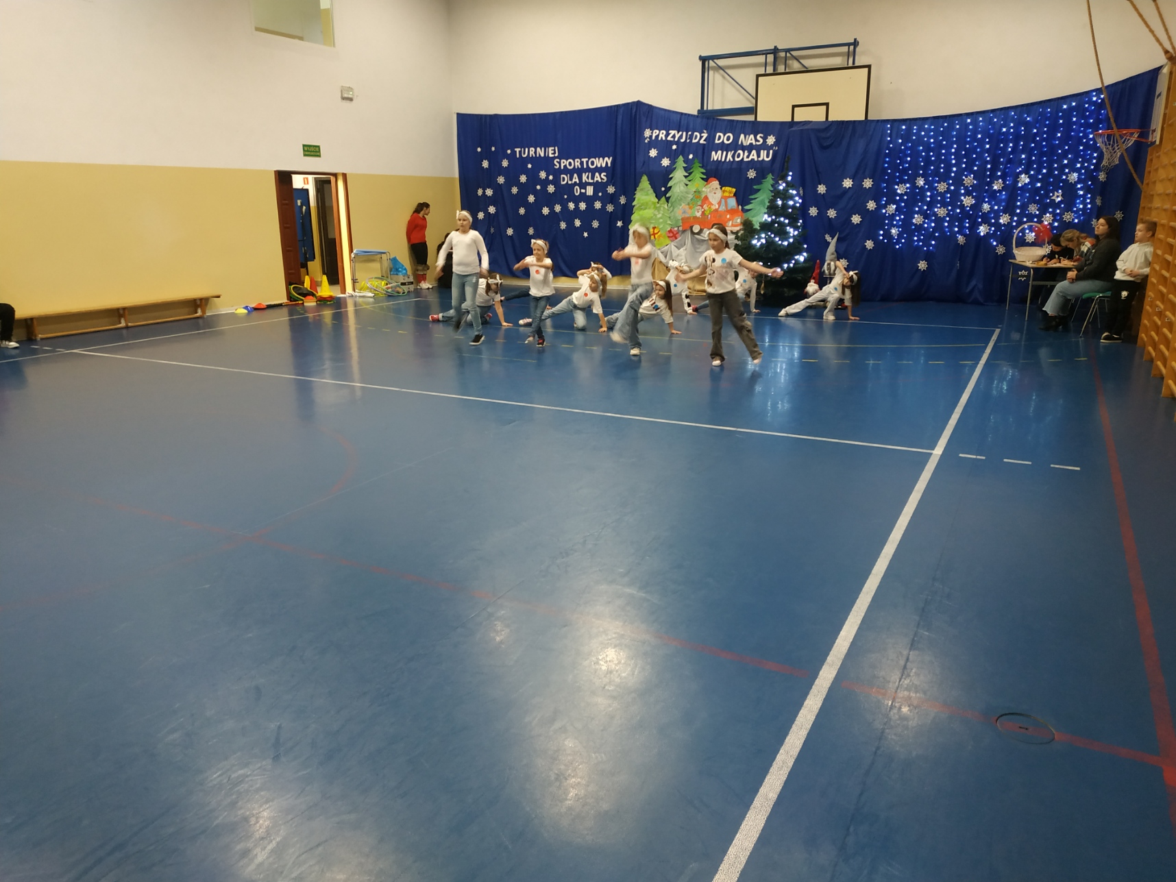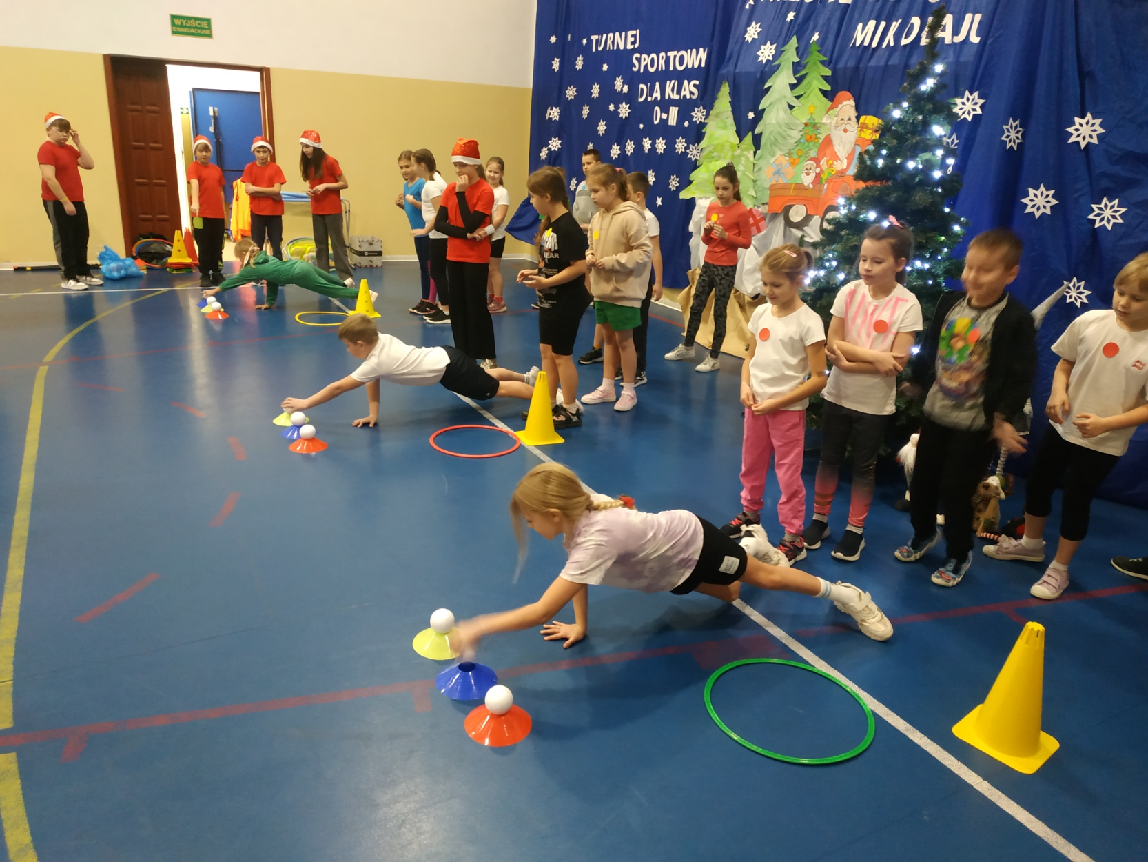 W dniu 16 grudnia w naszej szkole odbył się Mikołajkowy Turniej Sportowy, w którym wzięli udział uczniowie zerówki oraz klas I-III. Turniej zorganizowała Pani Dorota Supeł przy wsparciu klasy Vb. Uczniowie mieli okazję zmierzyć się w różnych konkurencjach sportowych, takich jak wyścigi w kocach, slalom z kijem hokejowym oraz układanie piłek z pozycji leżącej. Wspaniała atmosfera i radość z rywalizacji sprawiły, że wydarzenie na długo pozostanie w pamięci uczestników.