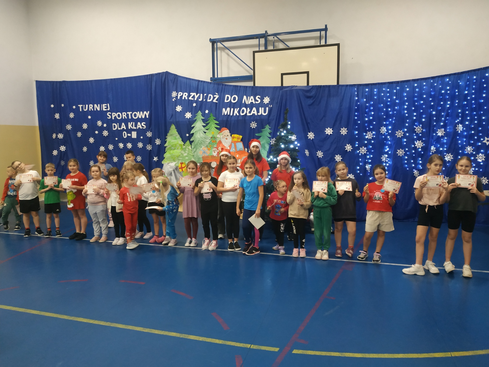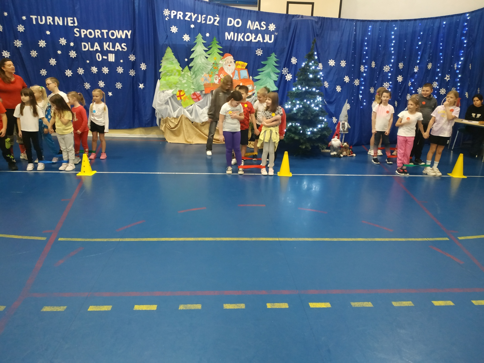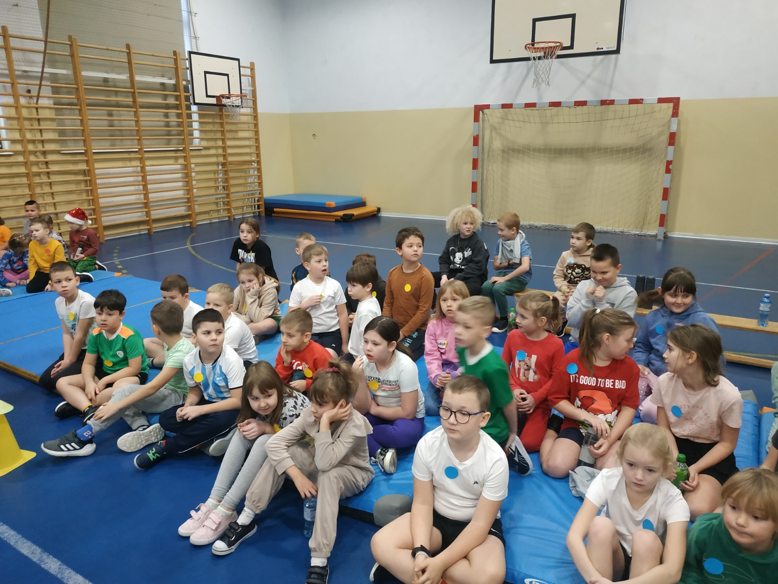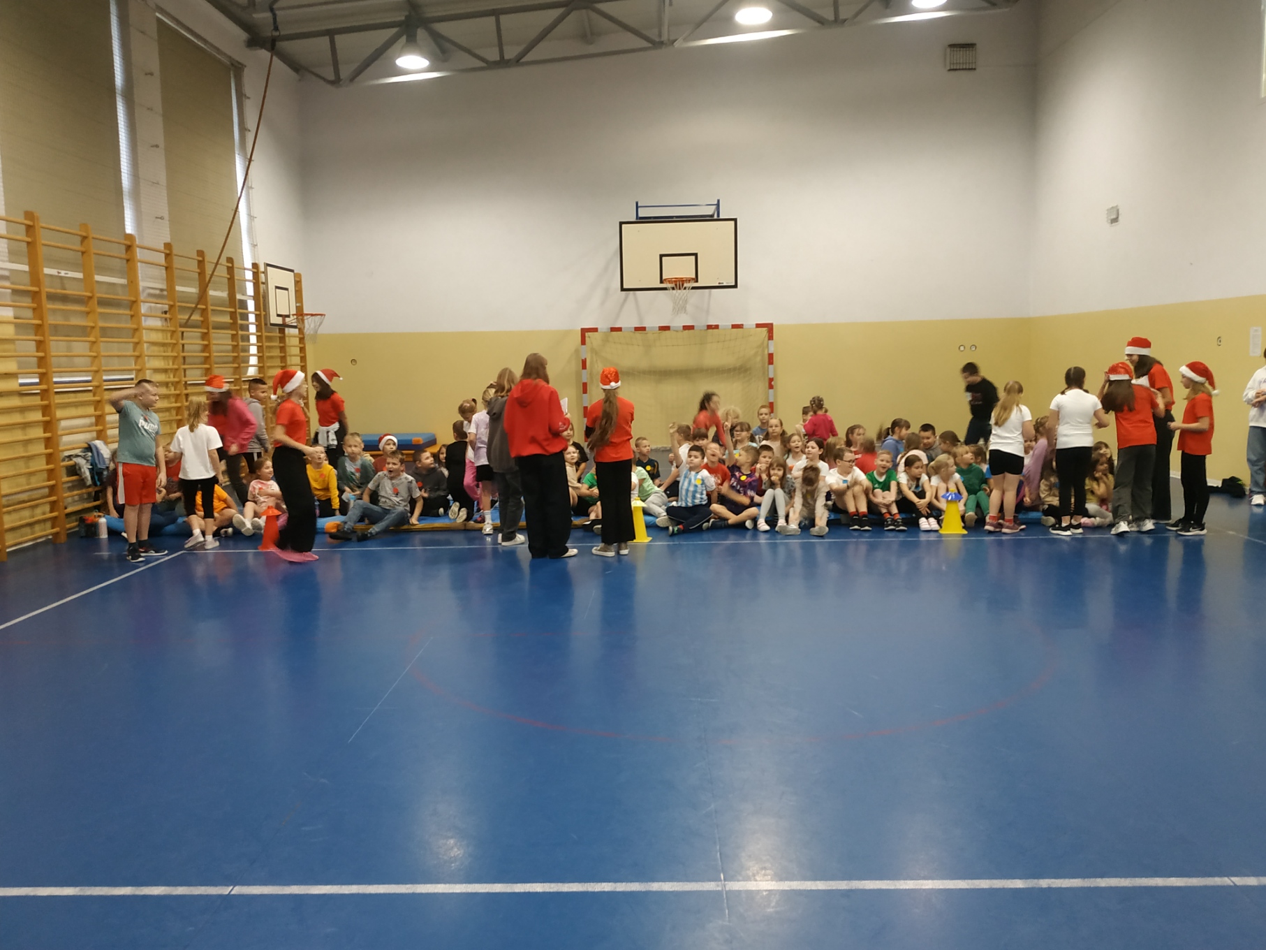 W dniu 16 grudnia w naszej szkole odbył się Mikołajkowy Turniej Sportowy, w którym wzięli udział uczniowie zerówki oraz klas I-III. Turniej zorganizowała Pani Dorota Supeł przy wsparciu klasy Vb. Uczniowie mieli okazję zmierzyć się w różnych konkurencjach sportowych, takich jak wyścigi w kocach, slalom z kijem hokejowym oraz układanie piłek z pozycji leżącej. Wspaniała atmosfera i radość z rywalizacji sprawiły, że wydarzenie na długo pozostanie w pamięci uczestników.
