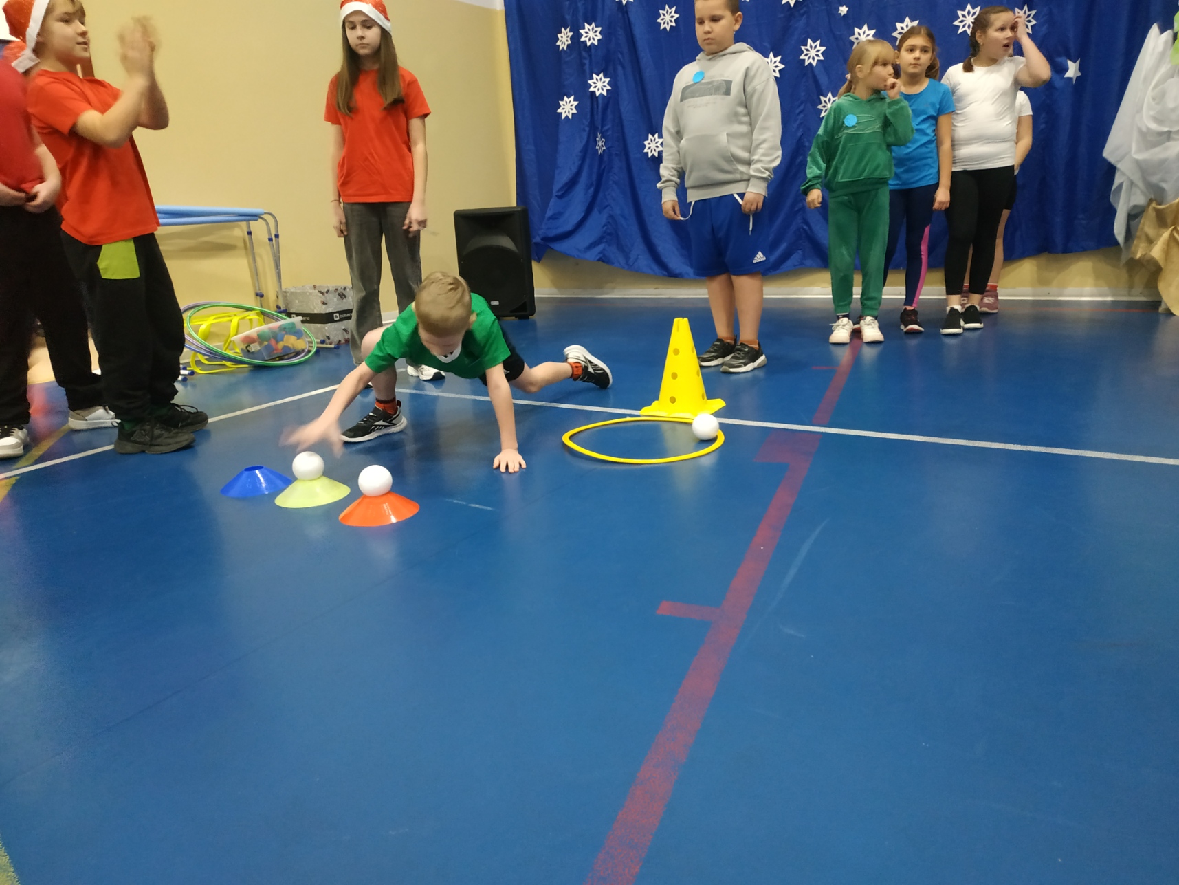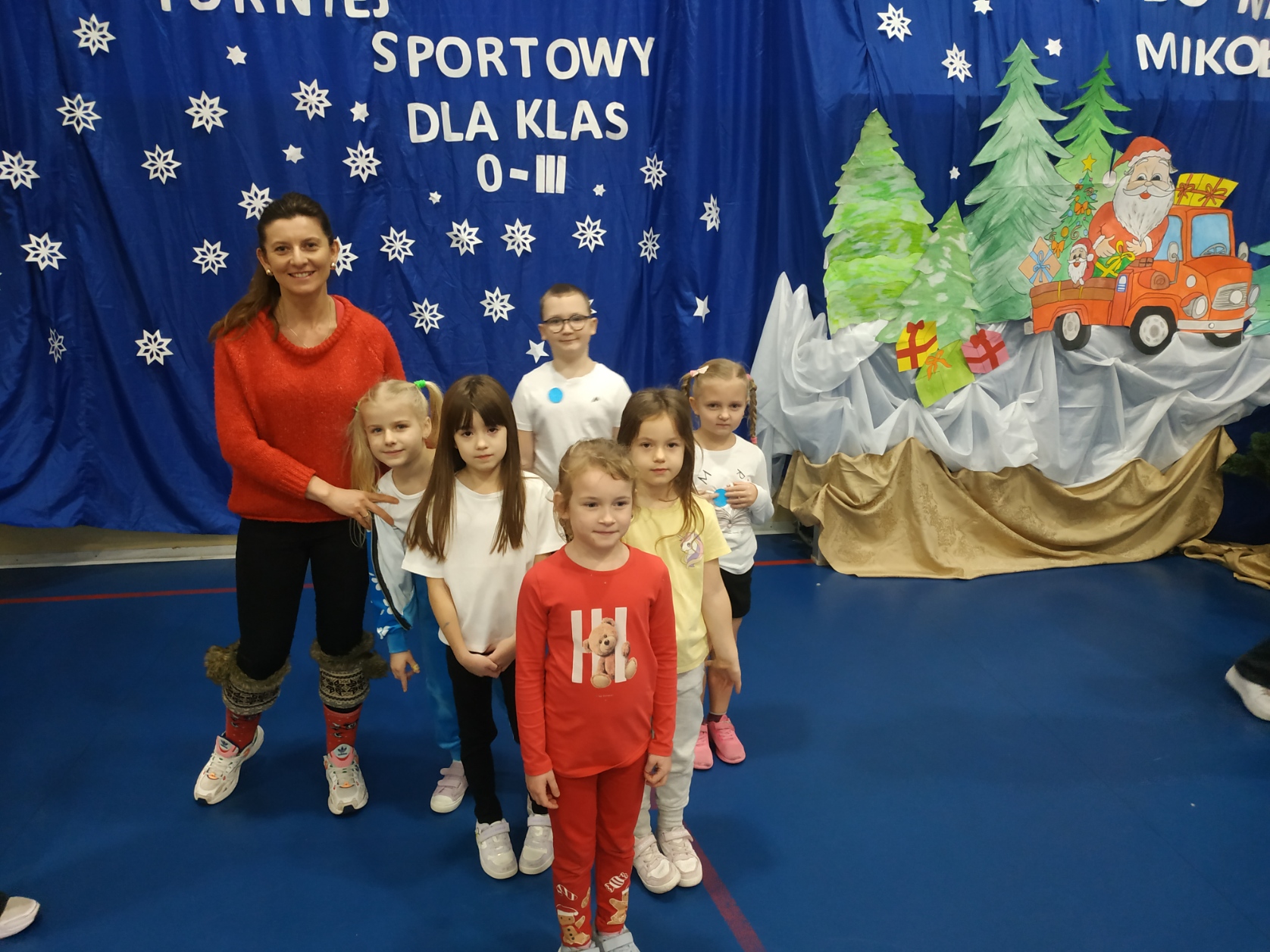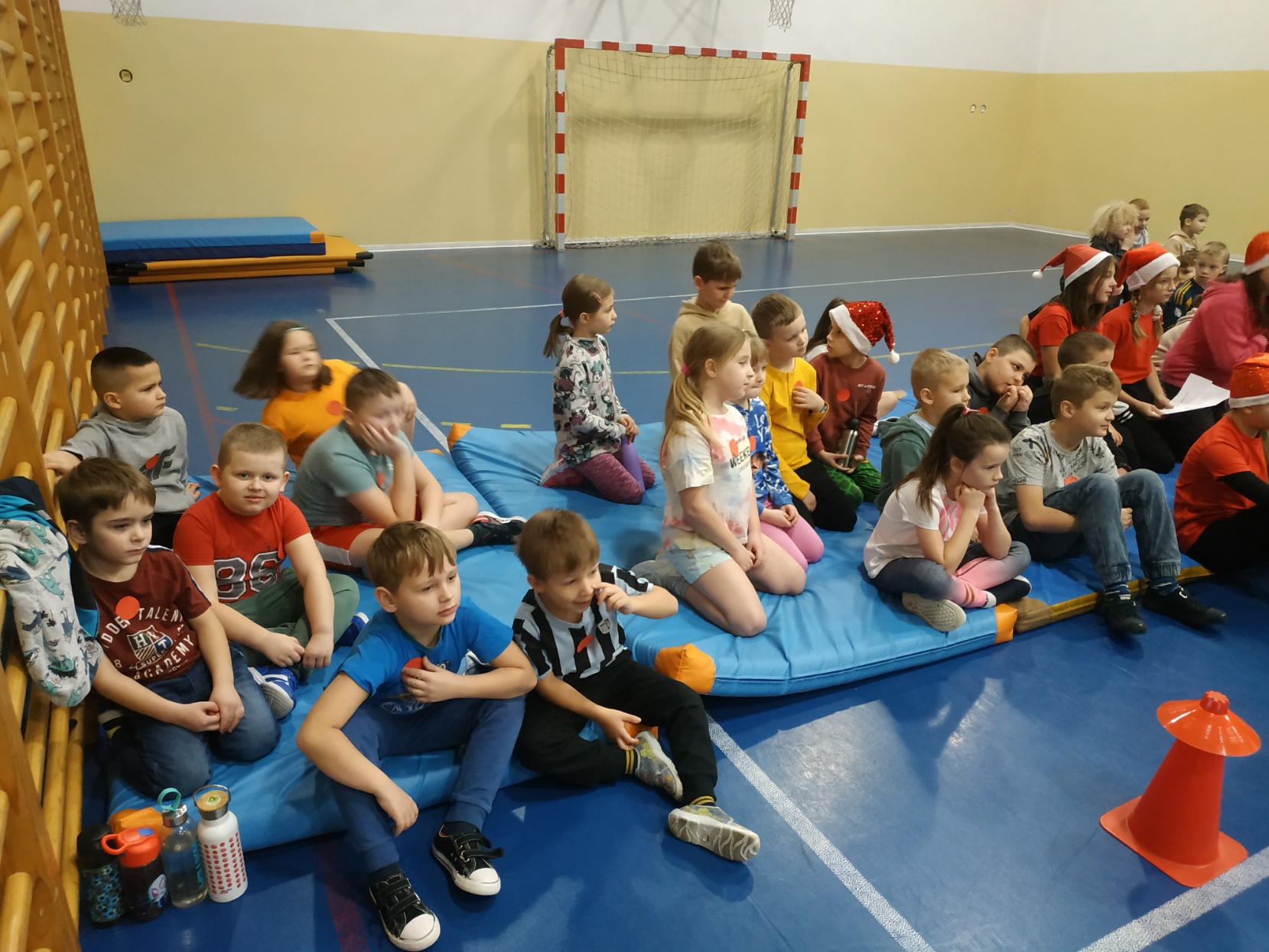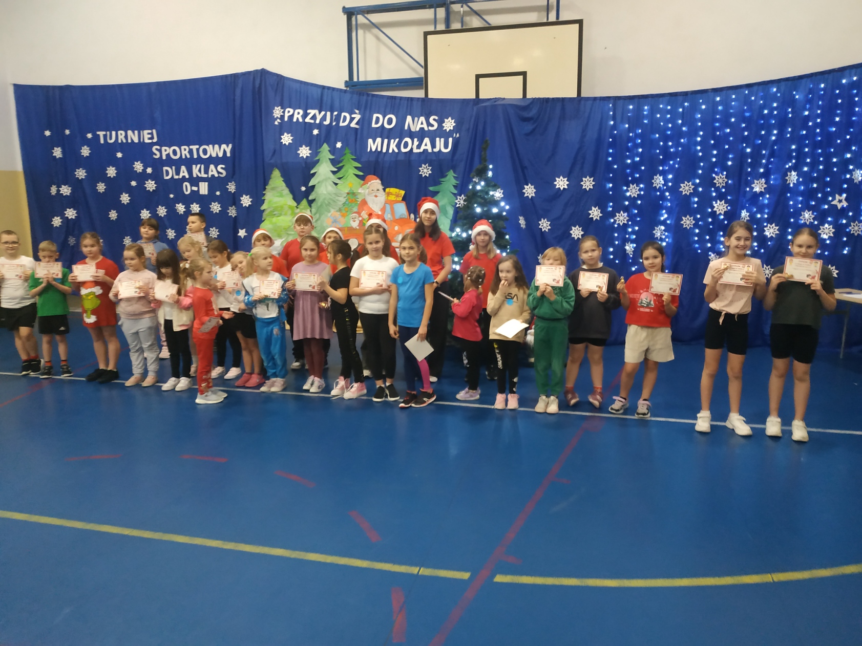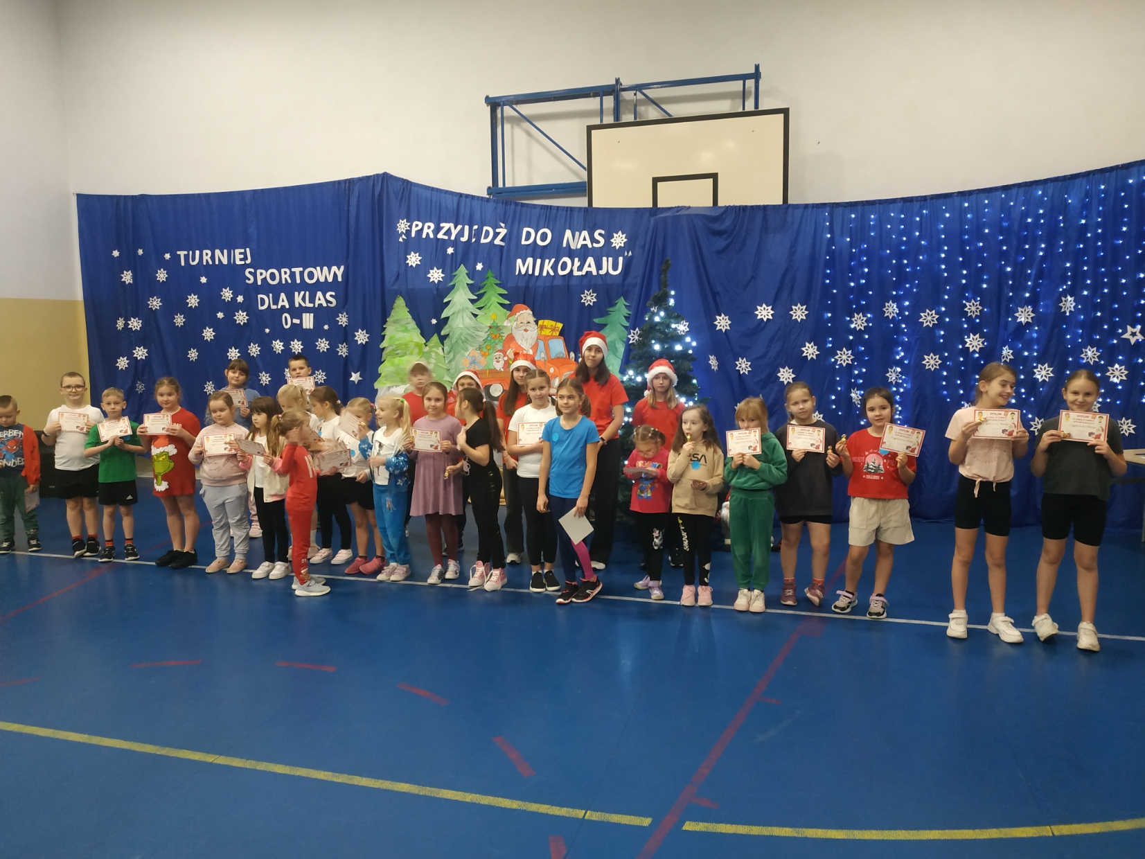 W dniu 16 grudnia w naszej szkole odbył się Mikołajkowy Turniej Sportowy, w którym wzięli udział uczniowie zerówki oraz klas I-III. Turniej zorganizowała Pani Dorota Supeł przy wsparciu klasy Vb. Uczniowie mieli okazję zmierzyć się w różnych konkurencjach sportowych, takich jak wyścigi w kocach, slalom z kijem hokejowym oraz układanie piłek z pozycji leżącej. Wspaniała atmosfera i radość z rywalizacji sprawiły, że wydarzenie na długo pozostanie w pamięci uczestników.