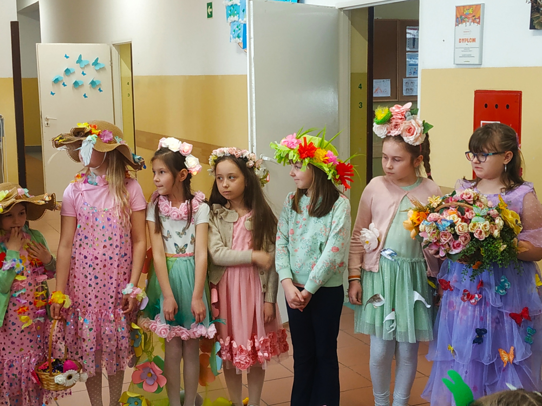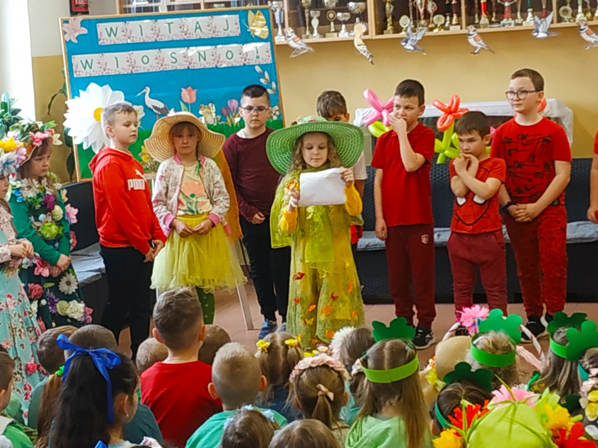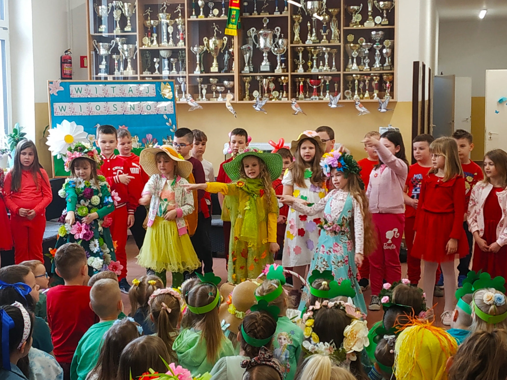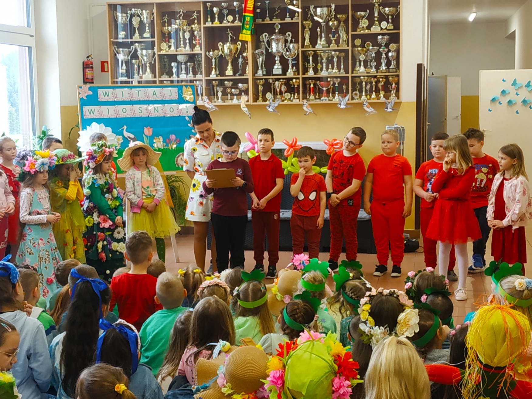 26 marca w naszej szkole odbyły się uroczyste obchody pierwszego dnia wiosny. Organizacją wydarzenia zajęły się pani Anna Rzeźnicka i pani Katarzyna Wróblewska, które wraz z uczniami klas Ia i Ib przygotowały krótkie występy artystyczne. Wspólnie z Samorządem Uczniowskim zadbały także o liczne konkursy i atrakcje, które zaangażowały całą społeczność szkolną.