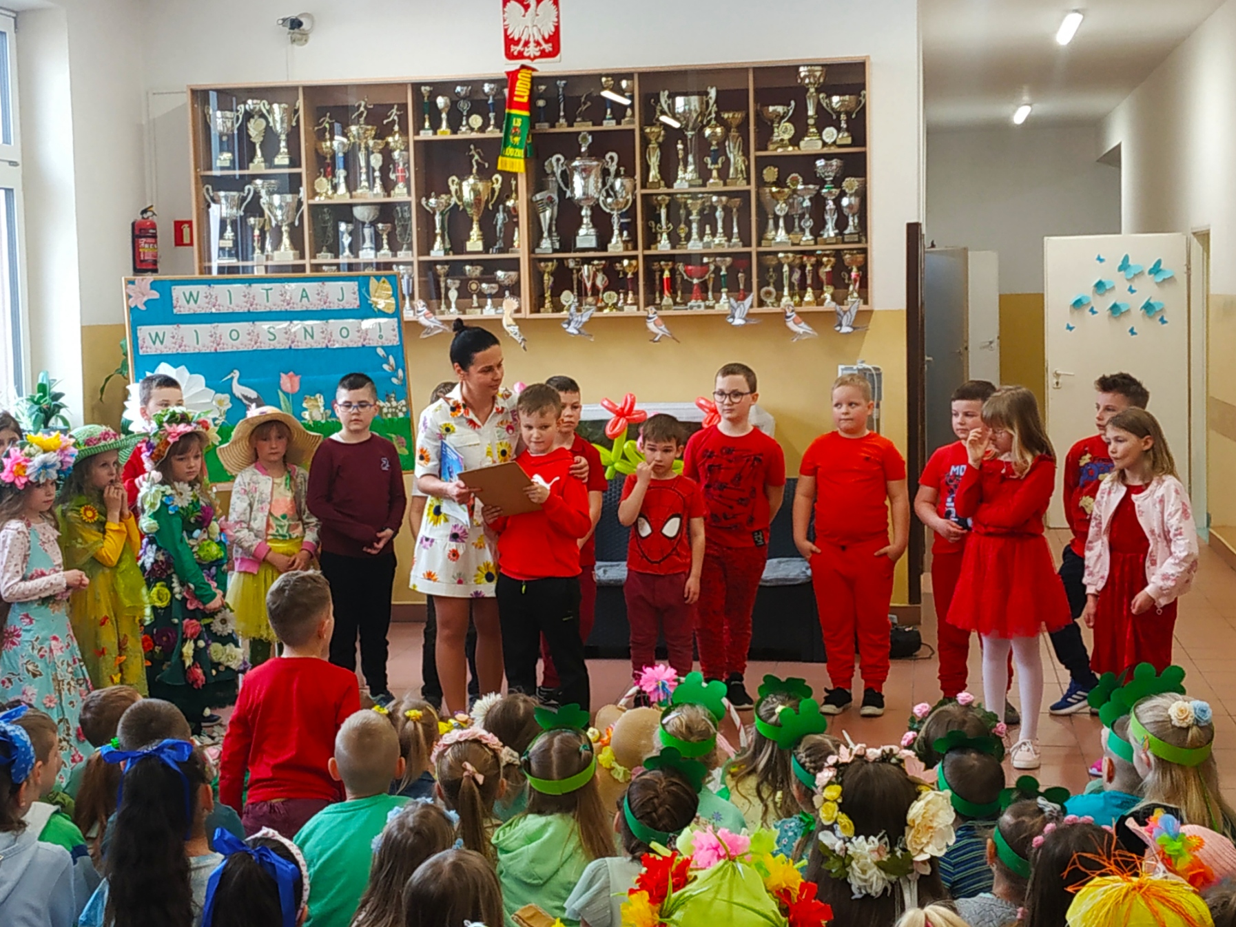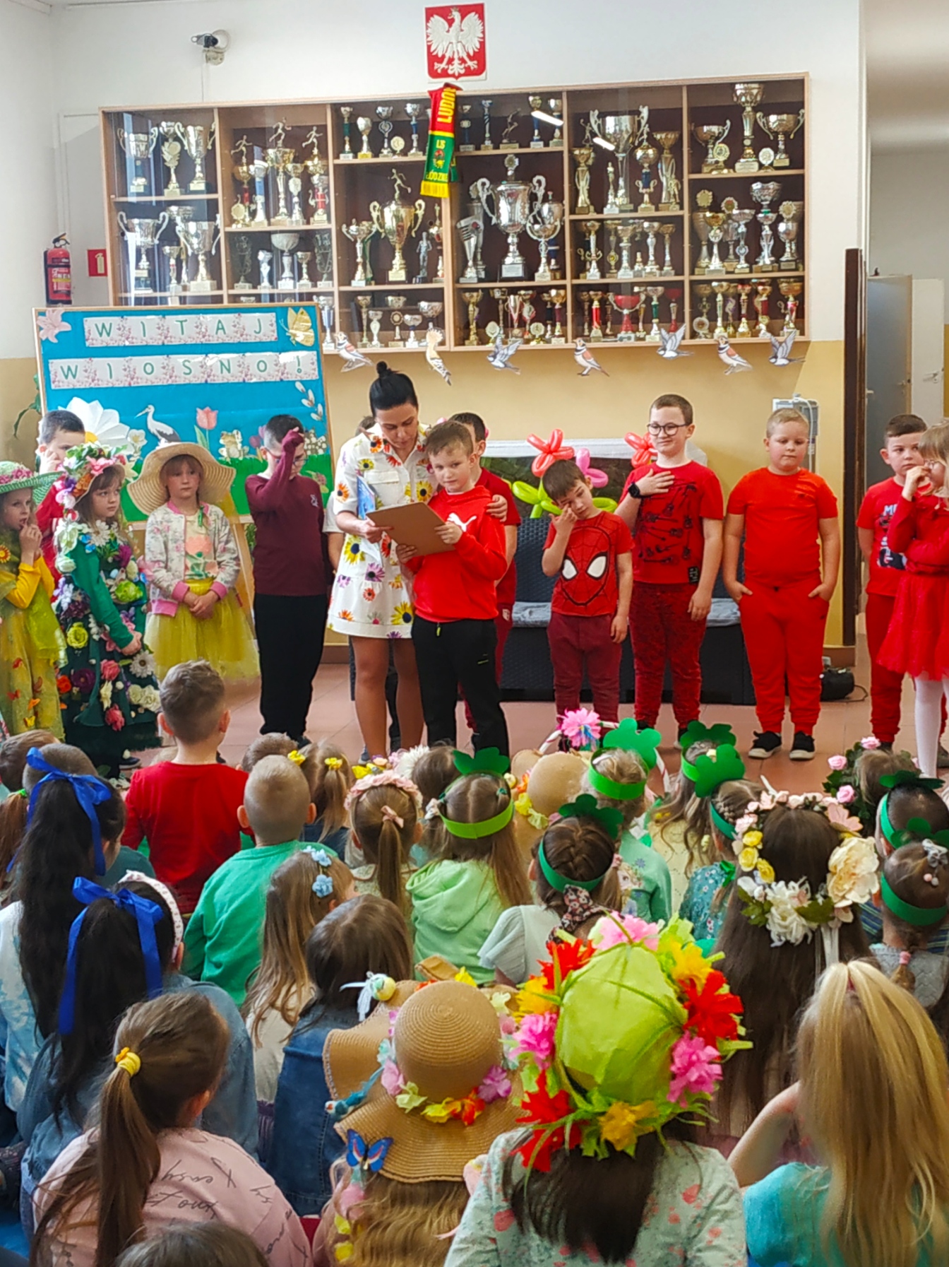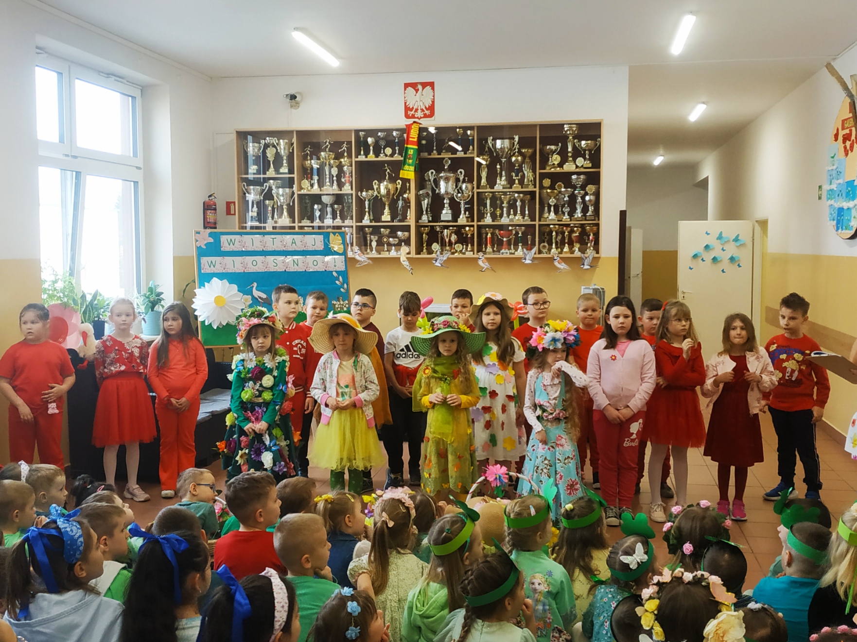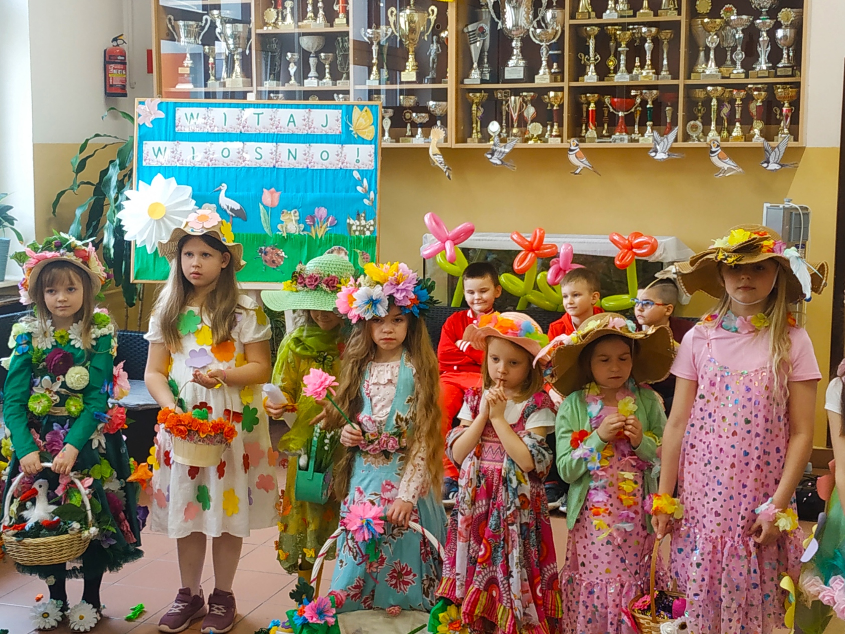 26 marca w naszej szkole odbyły się uroczyste obchody pierwszego dnia wiosny. Organizacją wydarzenia zajęły się pani Anna Rzeźnicka i pani Katarzyna Wróblewska, które wraz z uczniami klas Ia i Ib przygotowały krótkie występy artystyczne. Wspólnie z Samorządem Uczniowskim zadbały także o liczne konkursy i atrakcje, które zaangażowały całą społeczność szkolną.