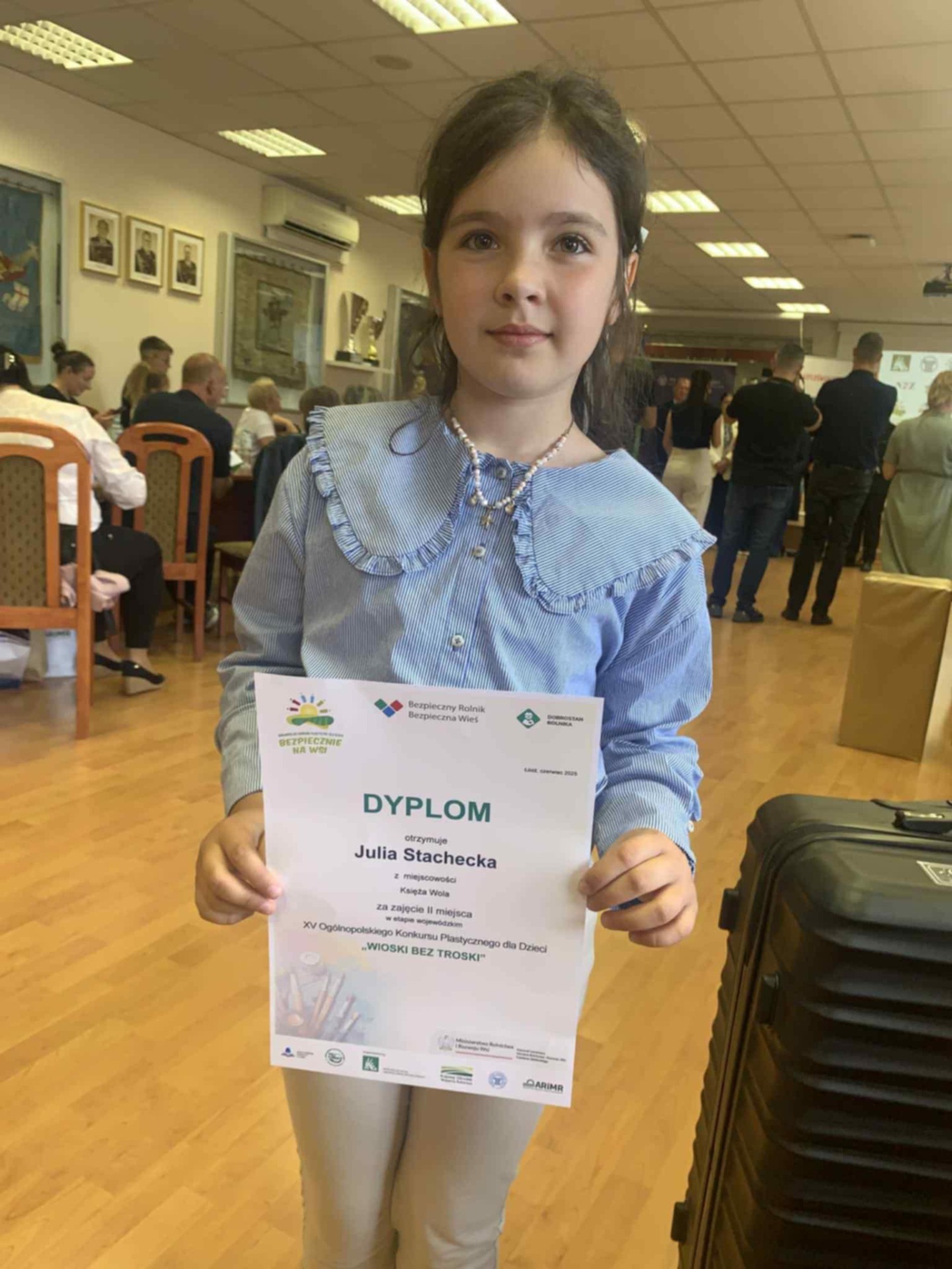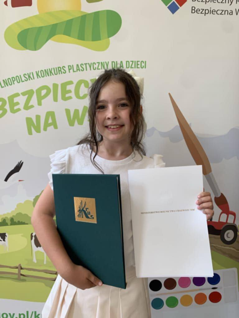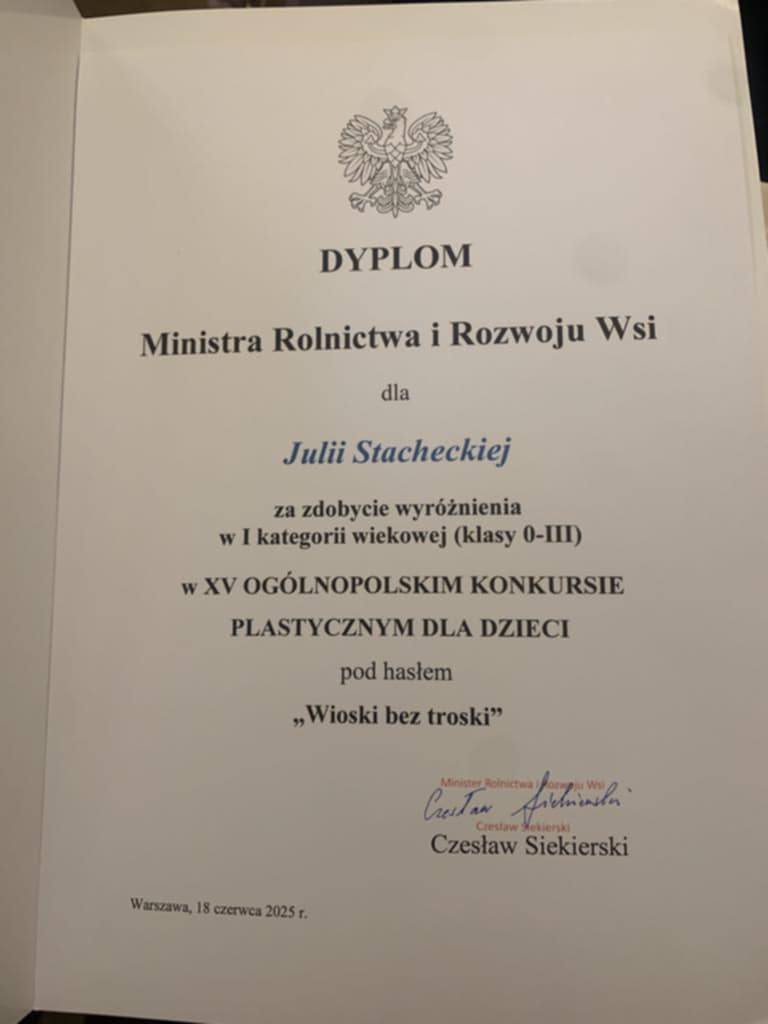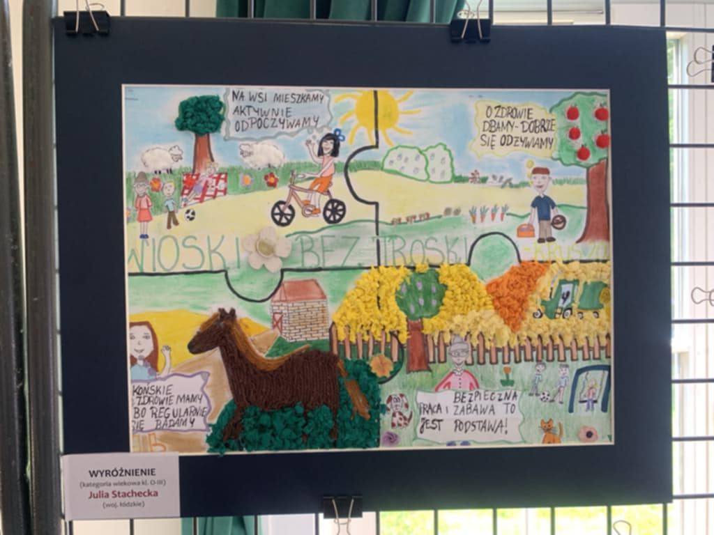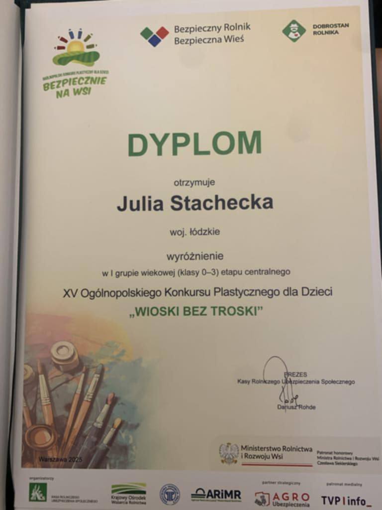 Serdecznie gratulujemy naszej uczennicy - Julii Stacheckiej. Jej praca plastyczna biorąca udział w Ogólnopolskim Konkursie pt. ,,Wioski bez troski" organizowanym przez KRUS, objętym honorowym patronatem przez Ministerstwo Rolnictwa zdobyła w kategorii wiekowej uczniów klas I-III szkół podstawowych I miejsce w powiecie rawskim, I miejsce w województwie łódzkim oraz wyróżnienie na szczeblu ogólnopolskim. To ogromny sukces. Jesteśmy dumni! Julia włożyła dużo zaangażowania w wykonanie swojej pracy, ale było warto.