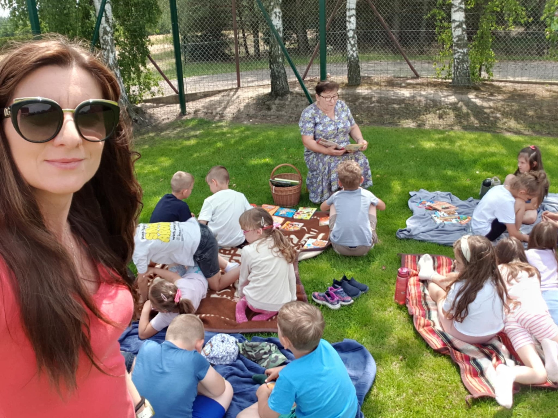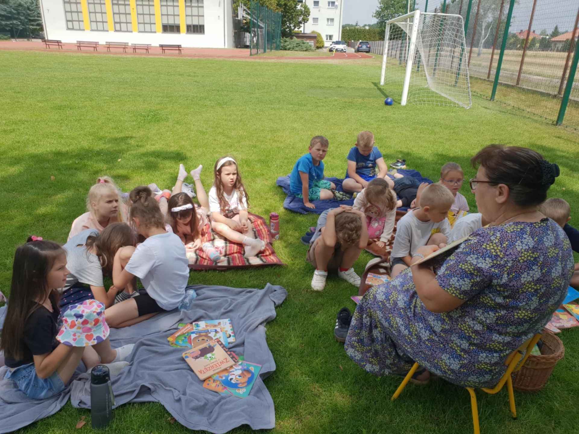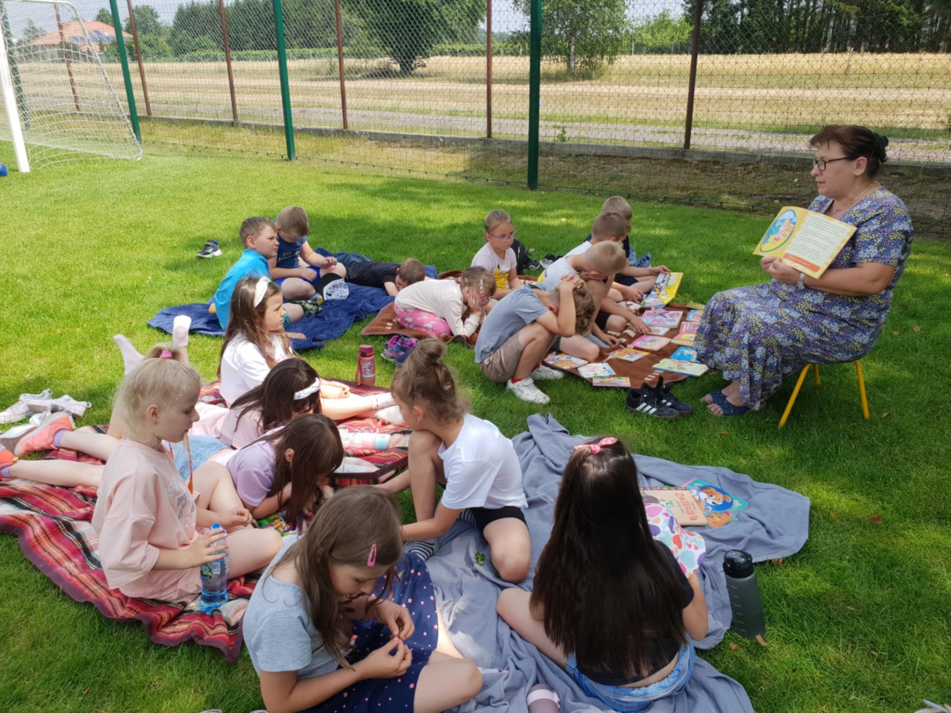Dzieci z zerówki słuchają opowiadania pt. "Bezpieczne wakacje" w ramach akcji CZYTANIE NA POLANIE.