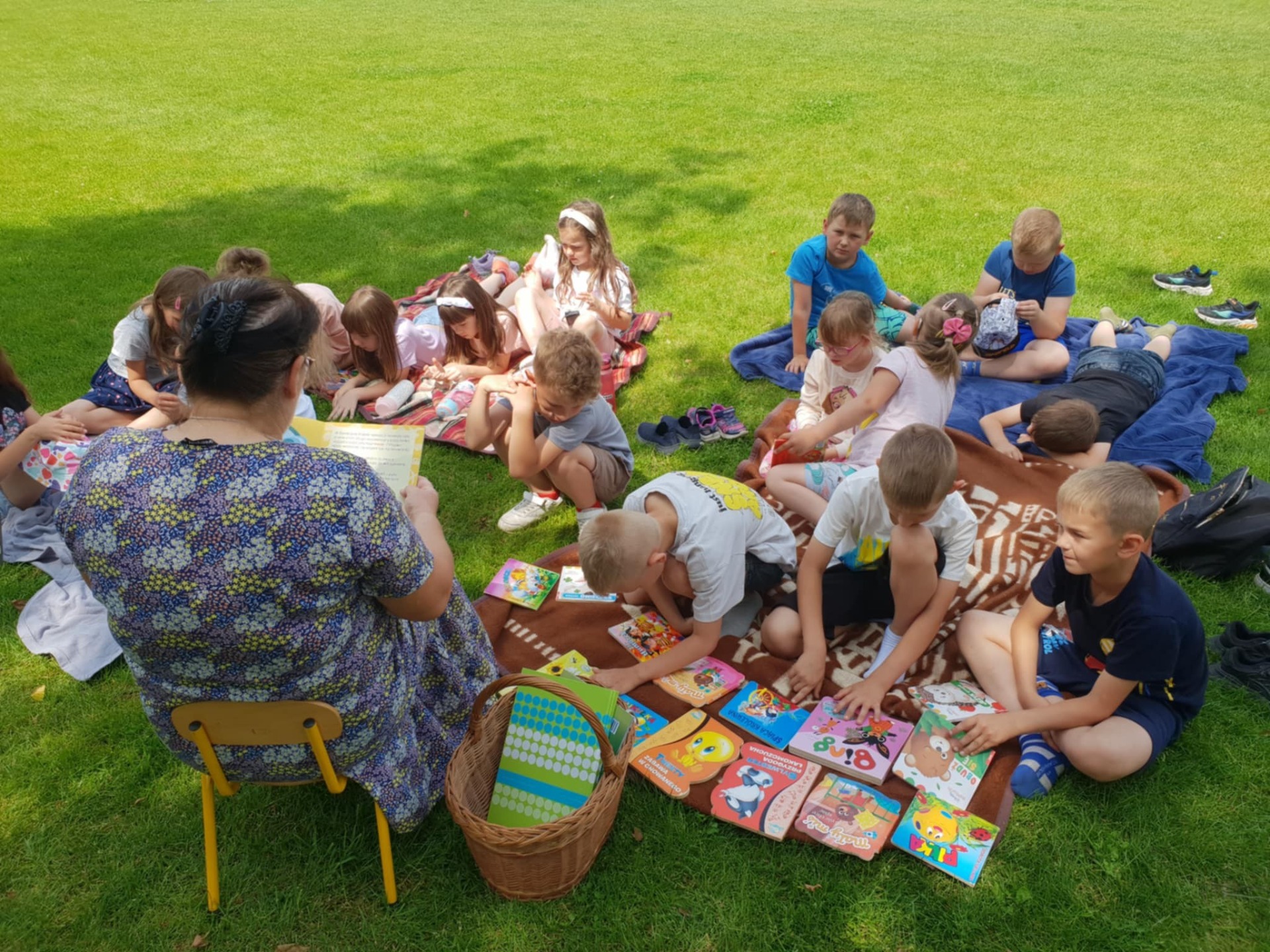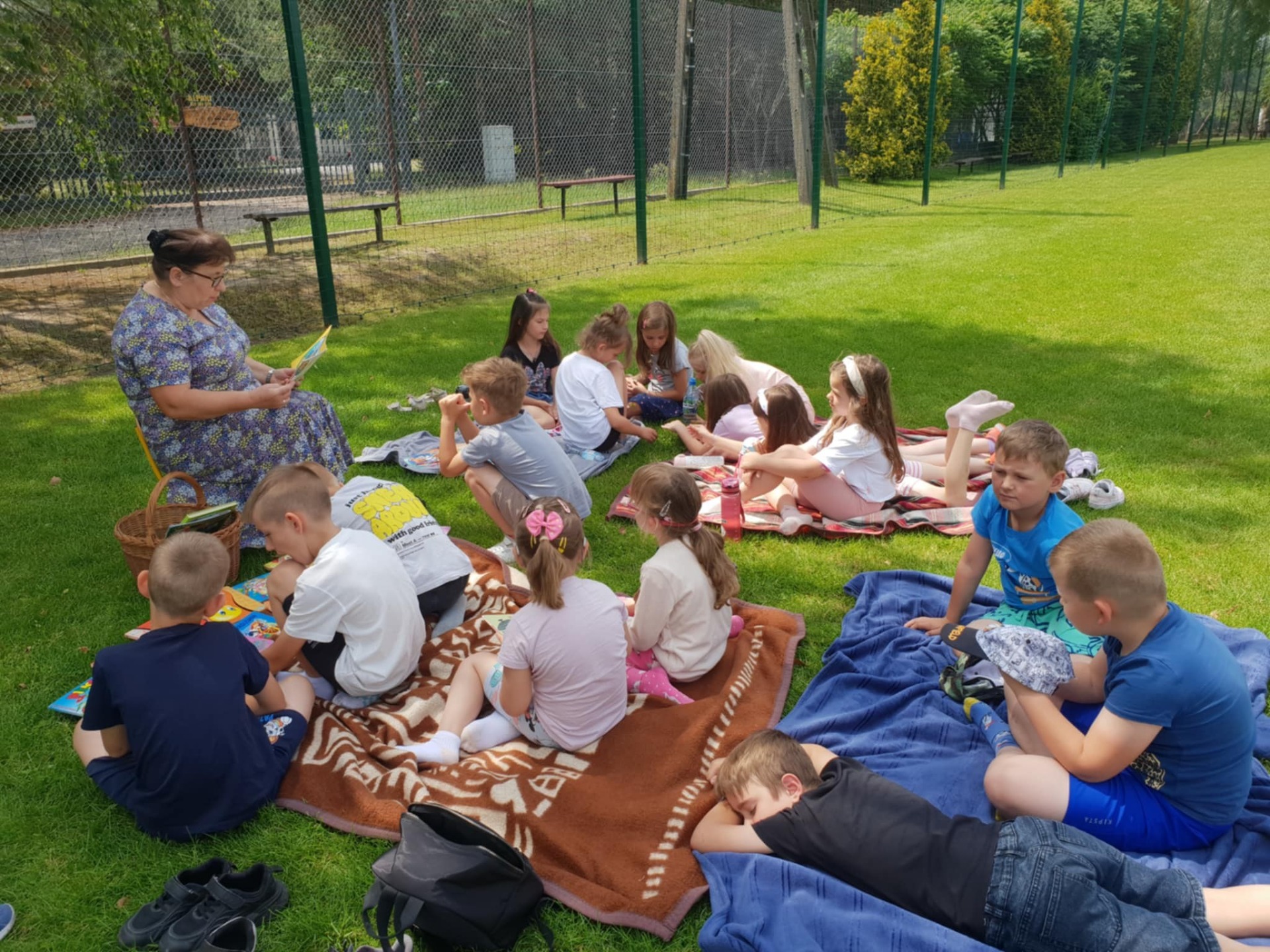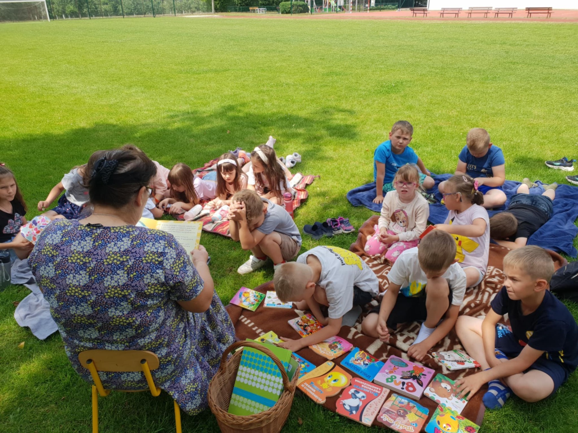 Dzieci z zerówki słuchają opowiadania pt. "Bezpieczne wakacje" w ramach akcji CZYTANIE NA POLANIE.