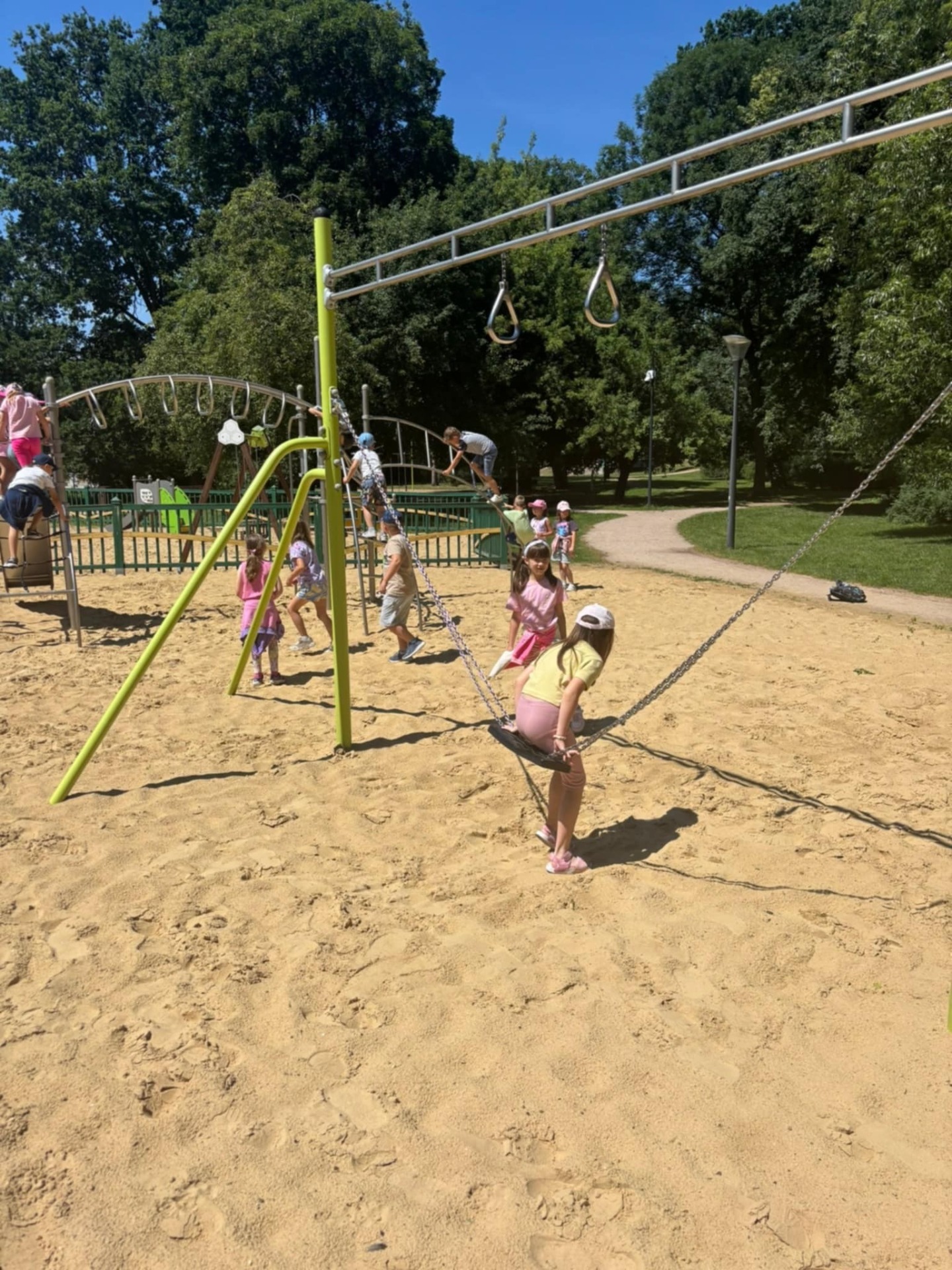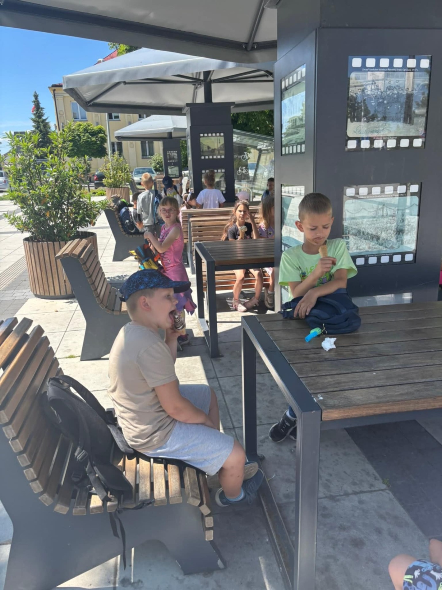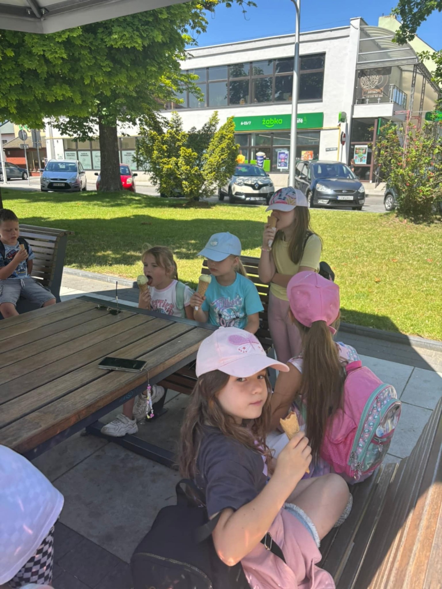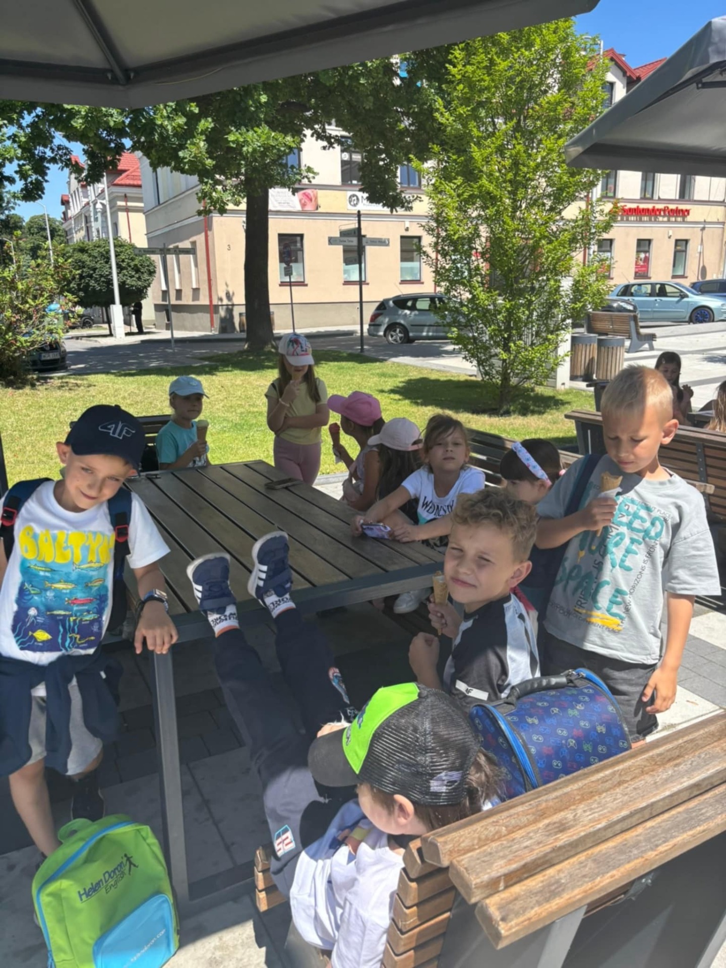 Na koniec- coś słodkiego! Lody wszystkim smakowały. W drodze powrotnej dzieci nie mogły odmówić sobie jeszcze jednego przystanku- placu zabaw. Bo jak się bawić, to na całego!