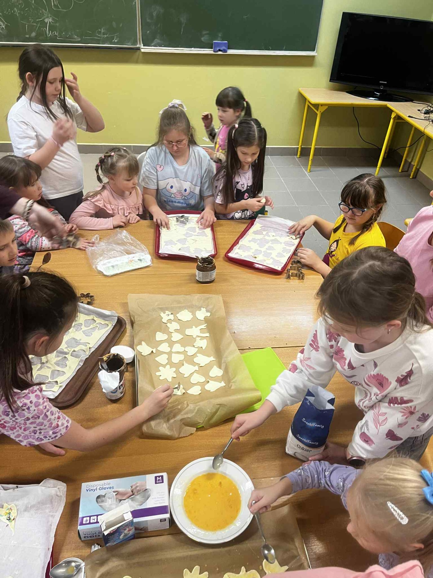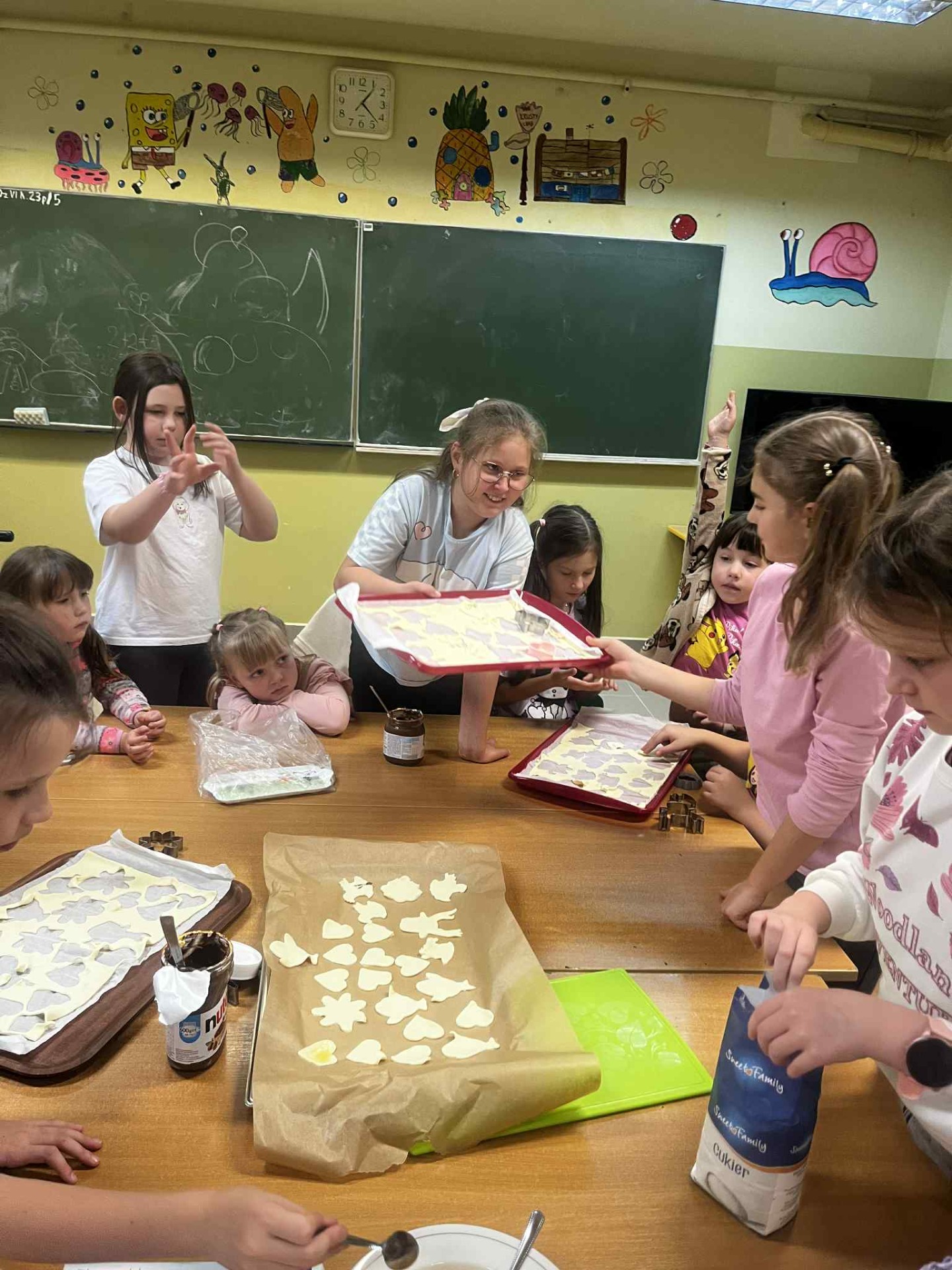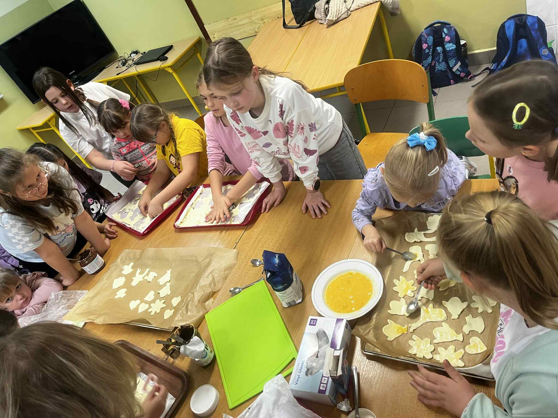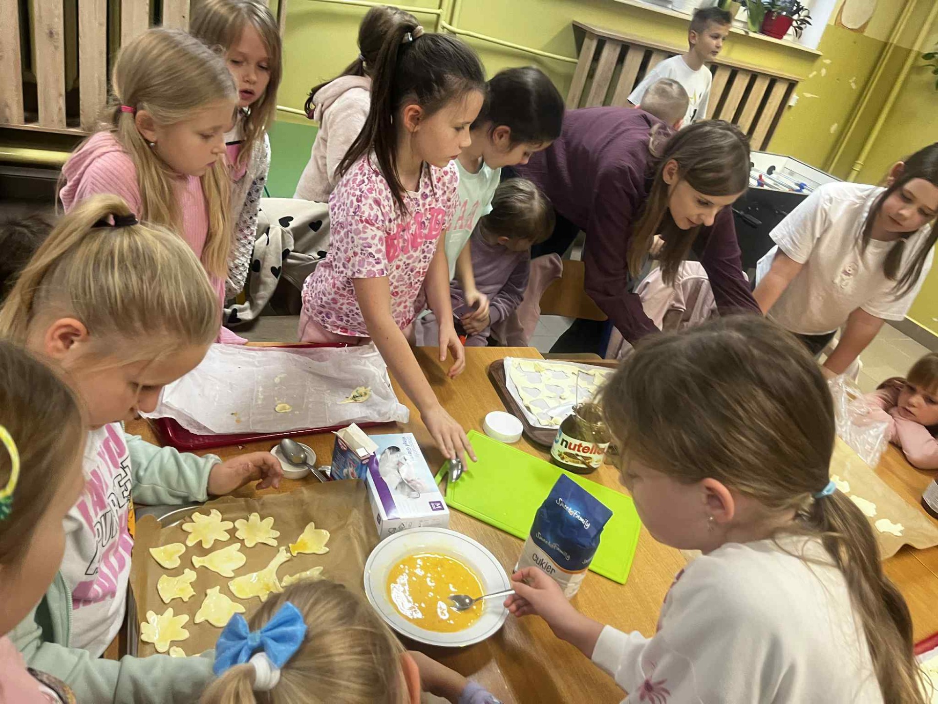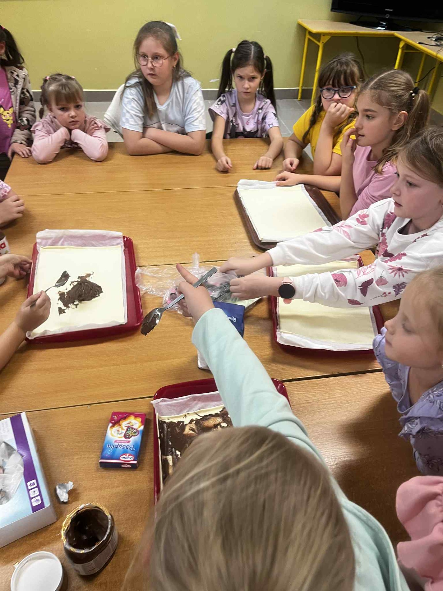 W ramach działań szkolnego Koła Towarzystwa Przyjaciół Dzieci (TPD) nasi uczniowie zamienili się w prawdziwych małych cukierników. Z ogromnym zaangażowaniem odmierzali składniki, kroili ciasto, zawijali ślimaczki i ozdabiali ciasteczka – a wszystko to z uśmiechem (i odrobiną kremu czekoladowego na nosie