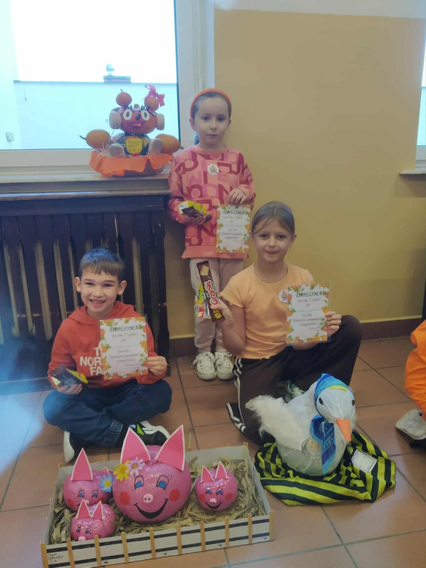 Uczniowie klas I-III oraz przedszkolaki wykonały 15 pięknych dyń. Wszyscy uczniowie otrzymali dyplomy, odznaki oraz cukierki natomiast miejsca I-III dyplomy, odznaki oraz słodkości. Wszystkim gratulujemy i zachęcamy do brania udziału w kolejnych konkursach