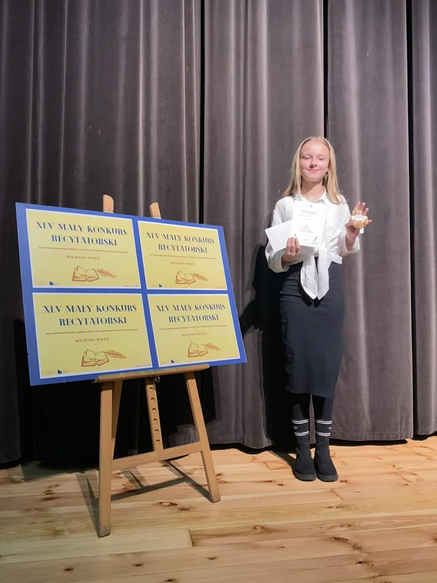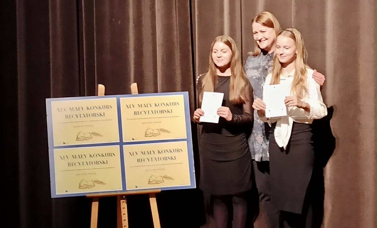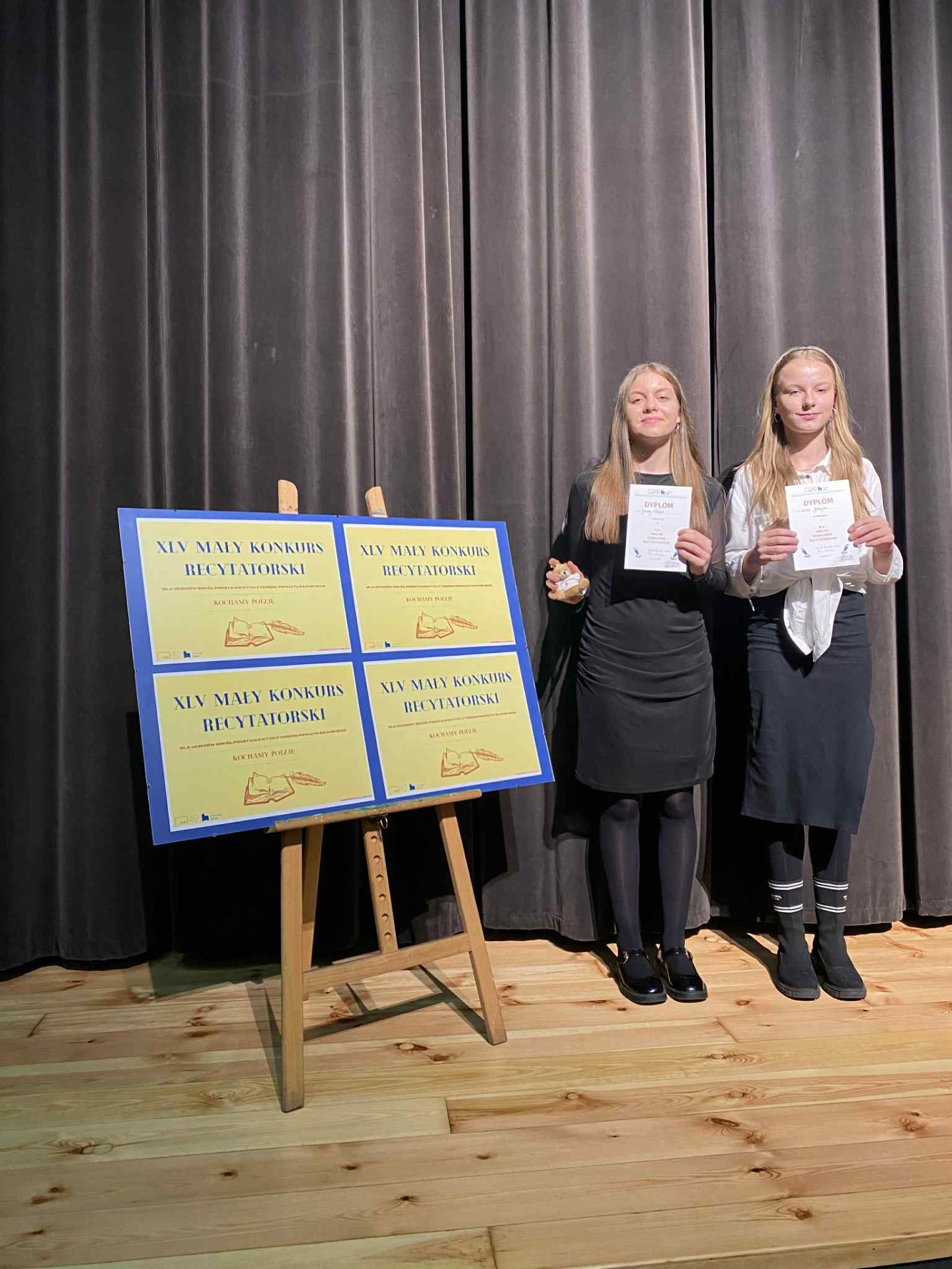 17 listopada dwie uczennice reprezentowały naszą szkołę w powiatowym konkursie recytatorskim w Miejskim Domu Kultury w Rawie Mazowieckiej. W kategorii klas IV-VI uczennica klasy VIb - Kamila Jędrzejak prezentowała wiersz Krzysztofa Kamila Baczyńskiego pt. „Elegia o chłopcu polskim” i zdobyła 2. miejsce. A w kategorii klas VII-VIII uczennica klasy VIII Joanna Kłoczko zaprezentowała utwór Wisławy Szymborskiej pt. „Sto pociech” i zajęła 2. miejsce. Gratulujemy i uczennicom i opiekunce p. Renacie Lipskiej.
