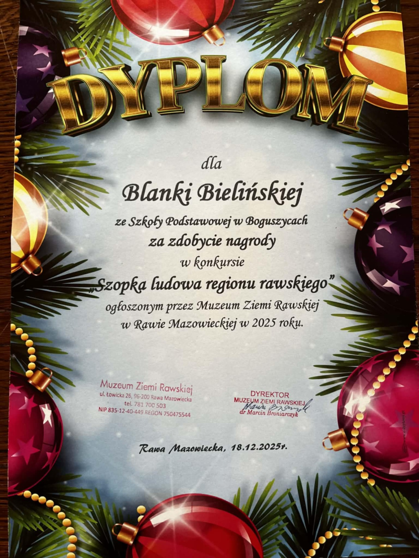 Dziękujemy za udział w konkursie na szopkę bożonarodzeniową. Do konkursu w Muzeum Ziemi Rawskiej w Rawie Mazowieckiej zgłoszono ponad 170 prac, wykonanych przez ponad 200 uczestników, a wśród nagrodzonych 107 prac, znalazła się praca naszej uczennicy Blanki Bielińskiej (klasa V). Prace na konkurs wykonali także: Nina Ornafa, Hanna Grzyb, Nikola Cała i Błażej Kocik. Wszystkim uczniom dziękujemy za zaangażowanie i gratulujemy pięknie wykonanych prac. Prace na konkurs zgłosiła pani Mariola Owczarek.
